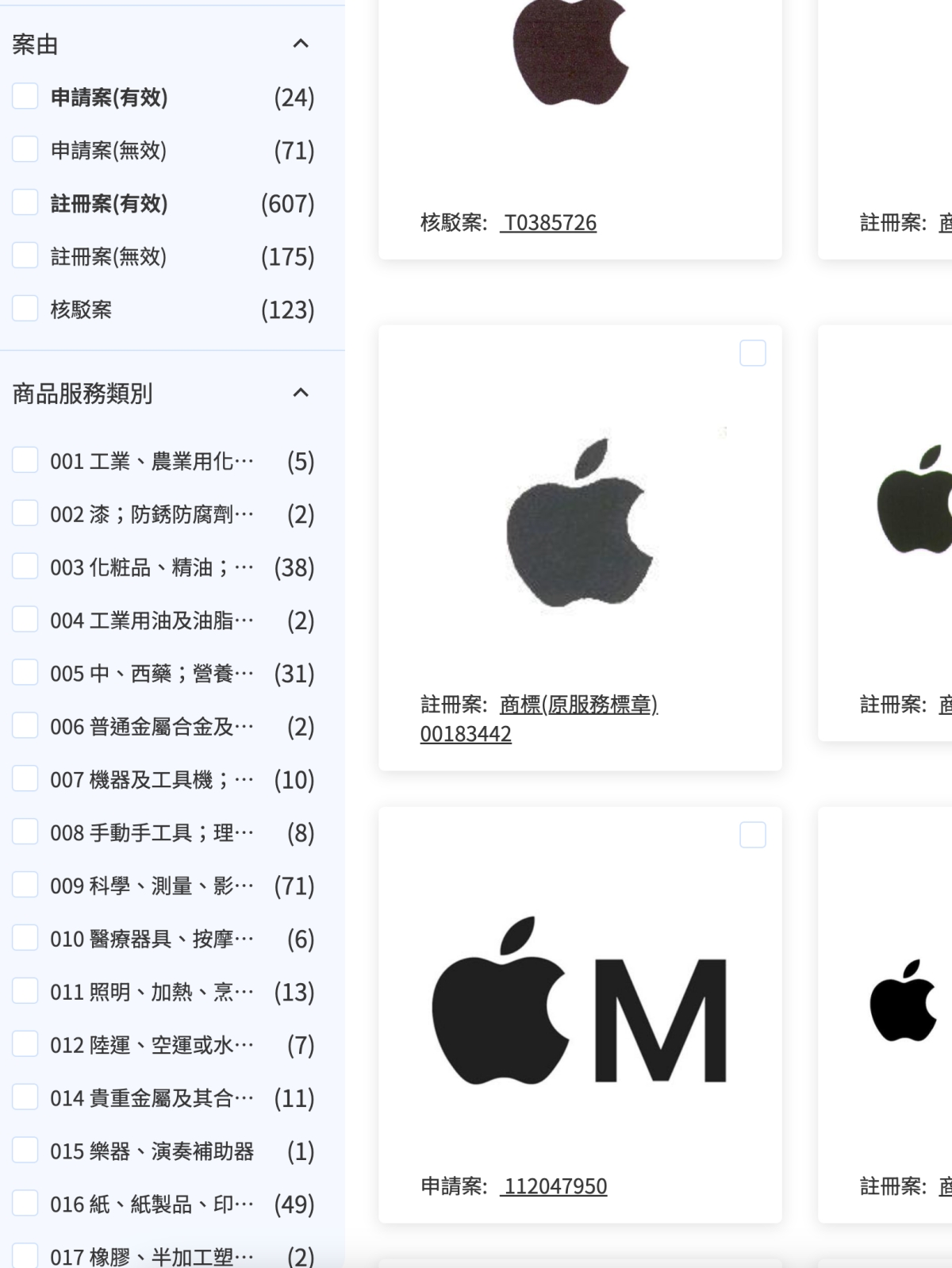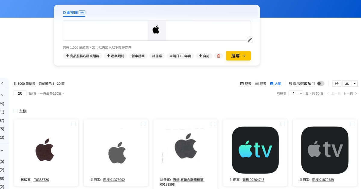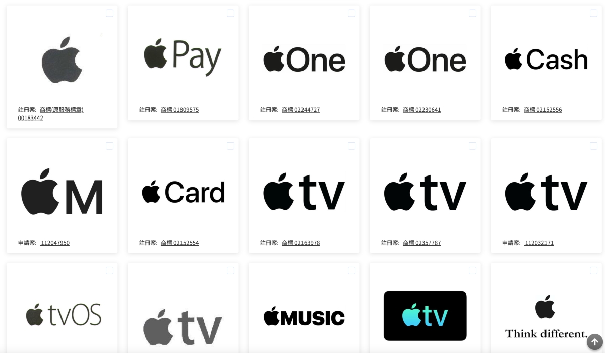 比如我把 Apple 的黑蘋果放上去比對,發現蘋果在台灣註冊的商標真的超級多,畢竟他們用到的真的很多,要是一個不小心被人註冊來亂搞就麻煩,幾乎所有用到的 Logo 他們全註冊了,不愧是商標吃過虧的公司。