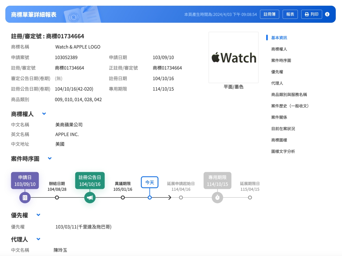 點撃商標資訊也可以再查看更多,比如名稱是什麼,註冊的時間,使用的商品類別等,都詳細的記載囉,大家如果有註冊商標的需求,記得可以先到這裡來找找,就可以省去不少麻煩。