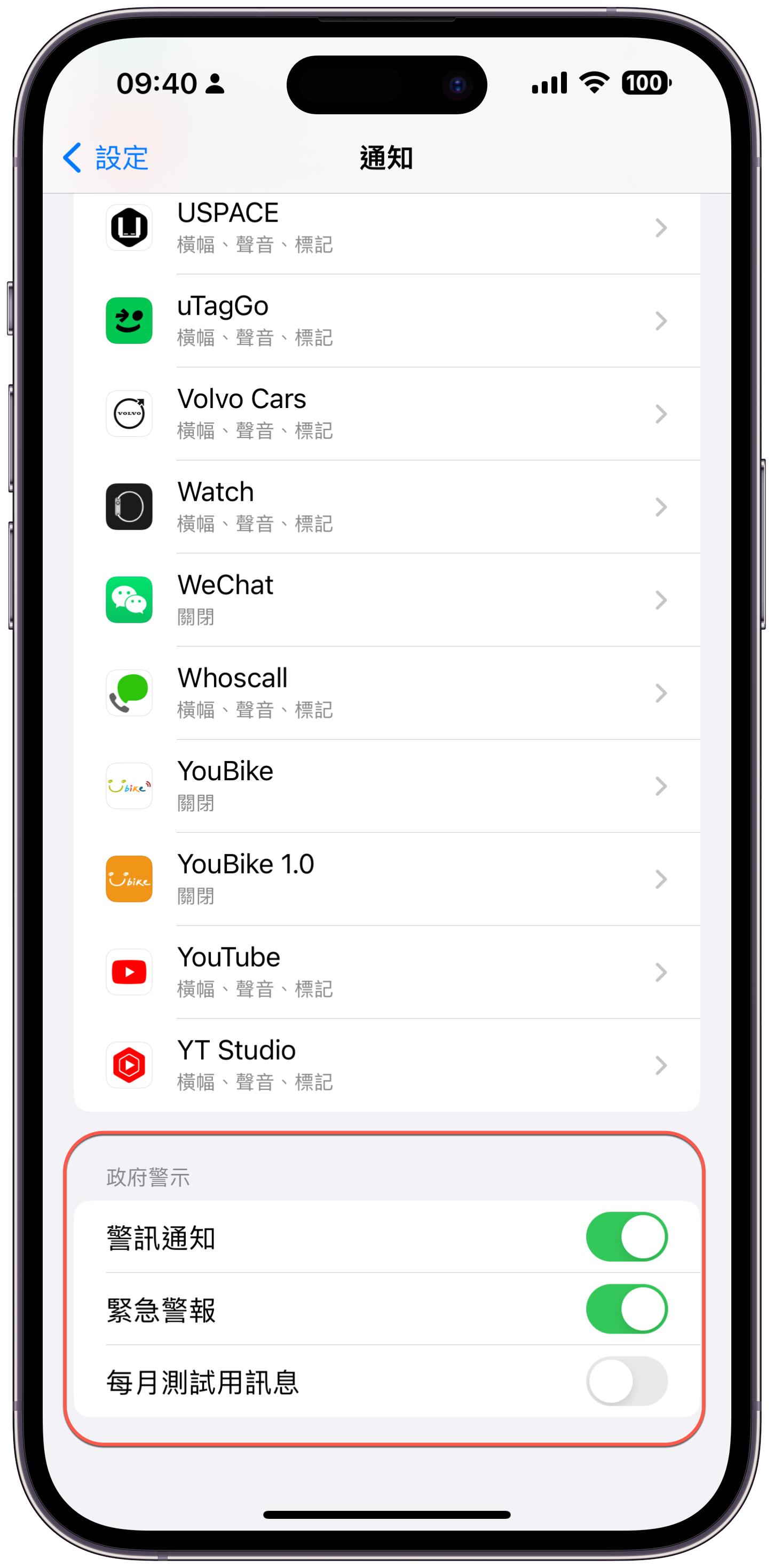 往下拉到底,就會看到有個政府警示,請檢查你的「警訊通知」跟「緊急警報」是否有開啟,測試訊息有時會很頻繁就看你要不要接收。
