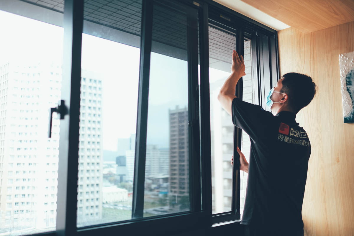 然後一一的丈量將防霾紗網固定上去,在這期間我也詢問了施工人員,一般如果沒有原本的紗窗框的話,比如像我們社區是可以在陽台安裝防霾紗窗,這種會怎麼製作,他們則是會連帶框一起製作,紗窗可以選擇不同方式來開關,所以家中除了既有紗窗外,如果有對外開口想要安裝防霾紗窗也是沒有問題的。