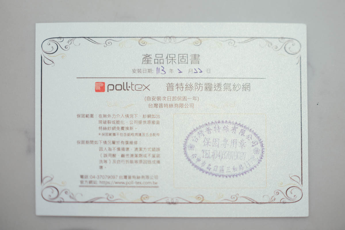 普特絲防霾紗窗保固有一年,只要不是刻意人為破壞,都可以免費更換,再套用一下我朋友說的心得,用了 5.6 年,每次沖洗一下就跟新的沒二樣啊。
