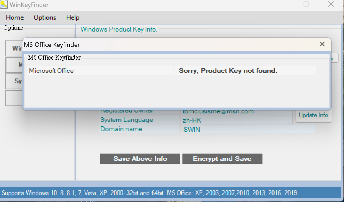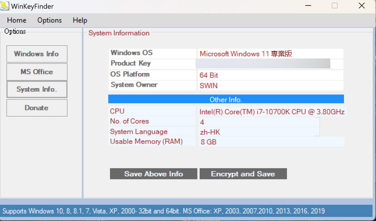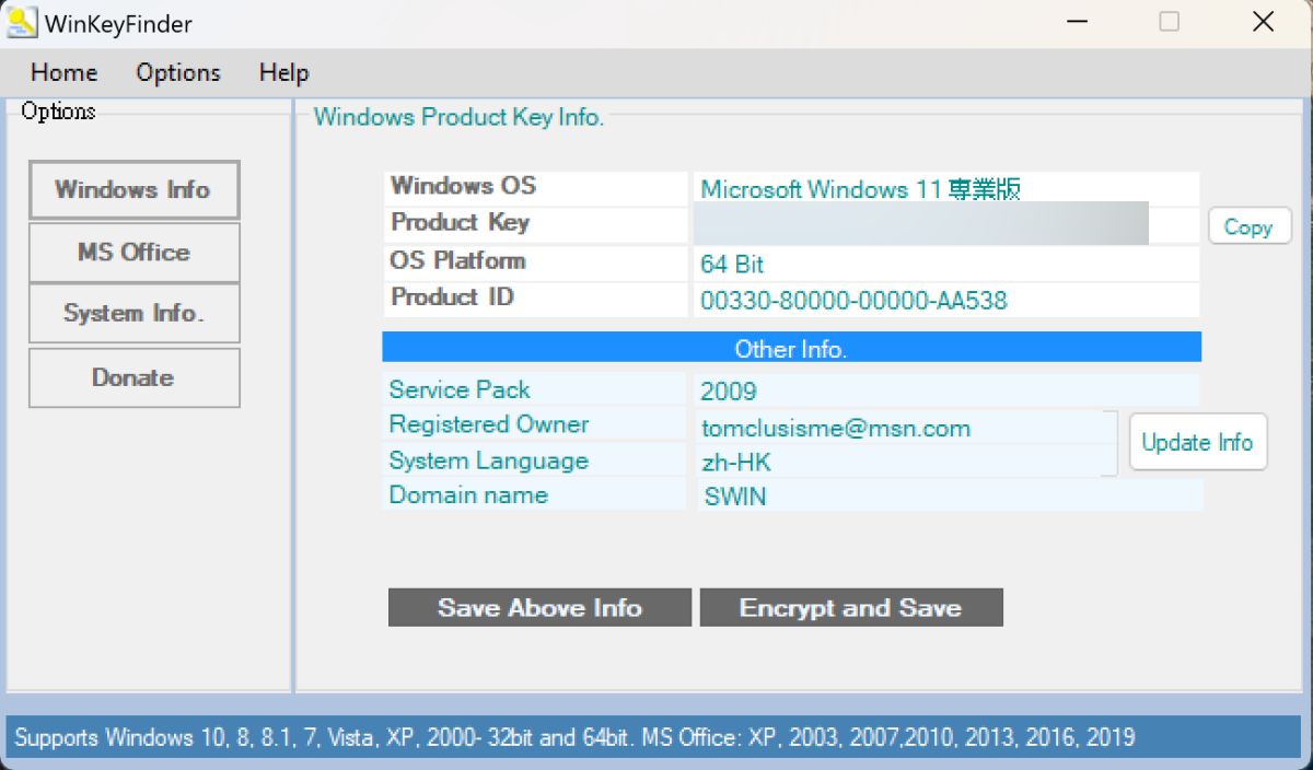 WinKeyFinder 下載:https://www.winkeyfinder.com/下載後,直接執行,在左邊就有 Windows Info 跟 MS Office 二個頁籤,比如我點撃 Windows Info 的,就可以查看到序號,第一行是 Windows 版本,第二行就是金鑰。