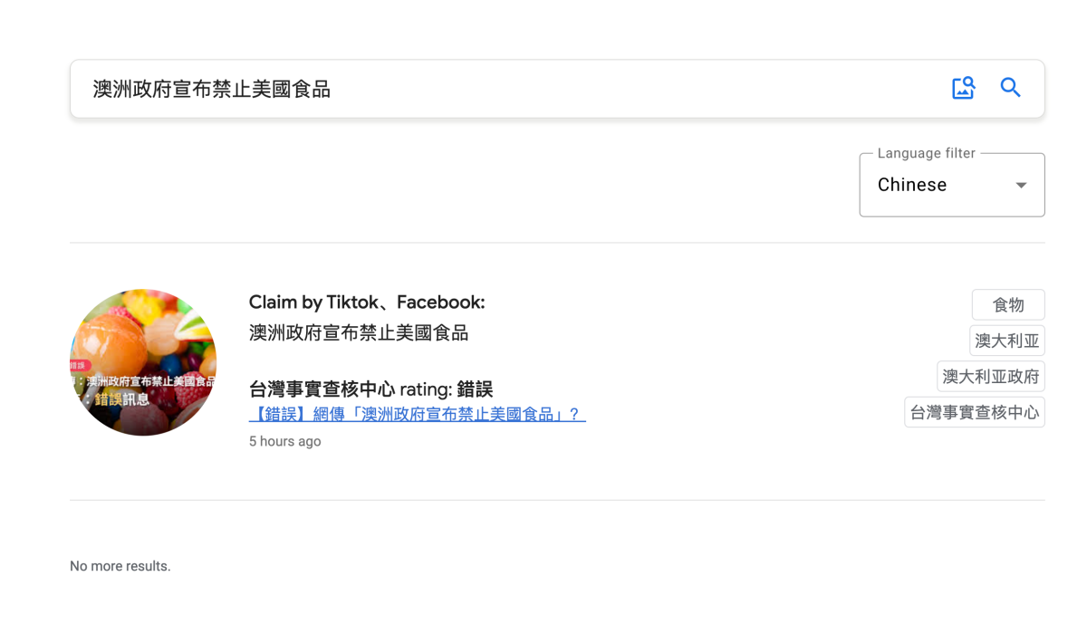 簡單試搜一下,會像這樣,直接顯示這是錯誤還是正確,點撃後也會前往查核的來源。以中文的內容來說,目前都是來自