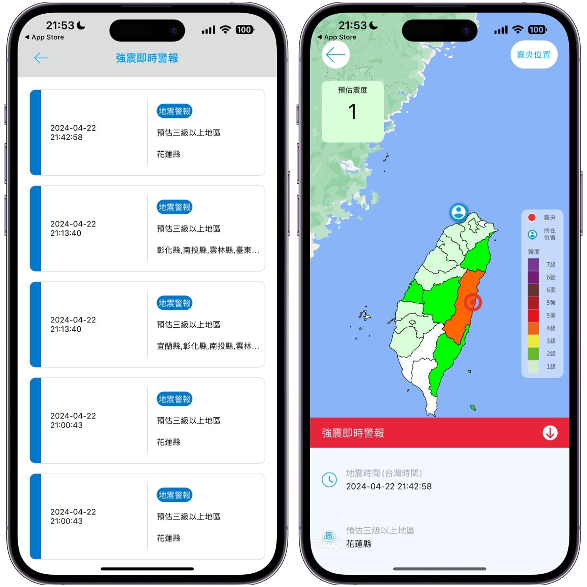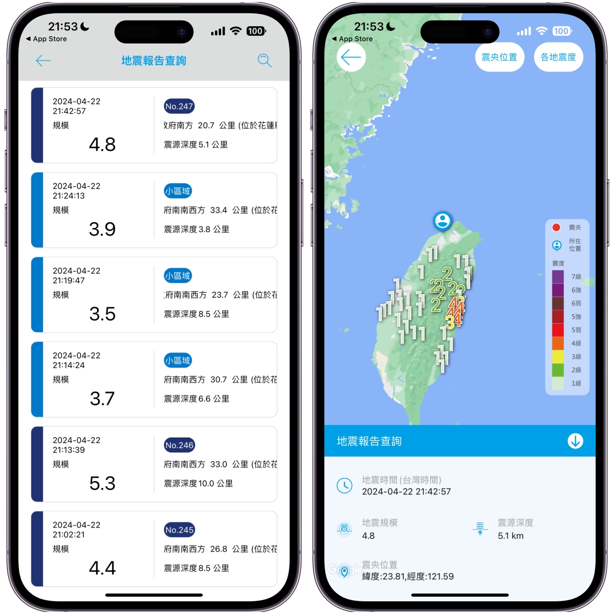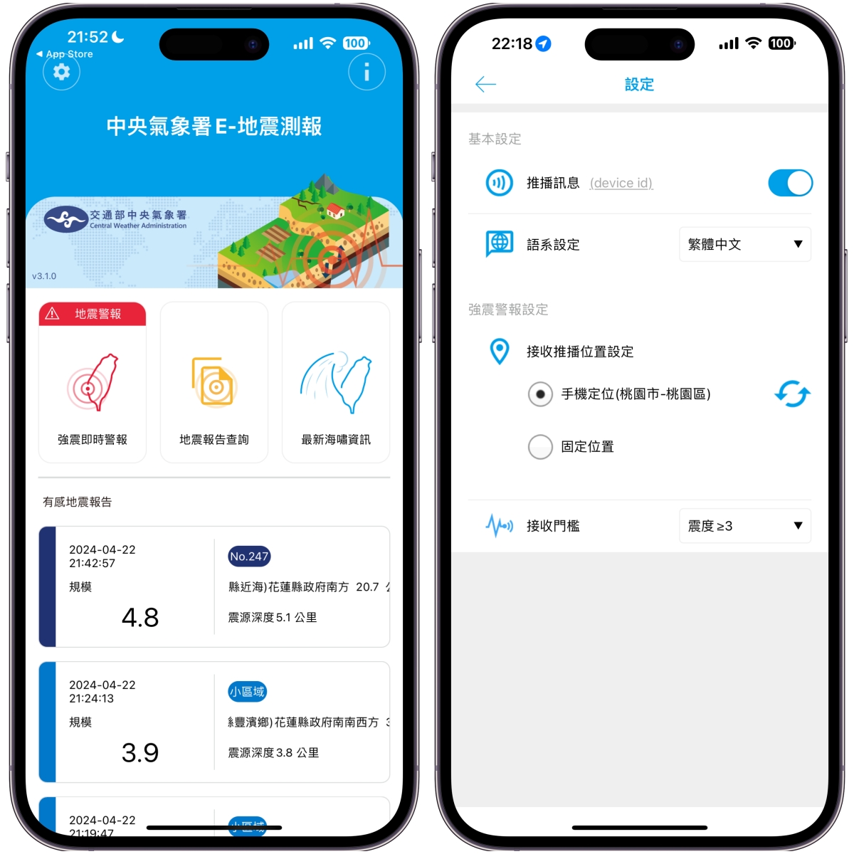 App 下載:Android、iOS下載安裝後,在首頁就有近期的所有地震資訊,另外在設定裡也可以依據你所在的定位(或選一個位置)推送通知,還可以自行選擇震度多少以上就發送。