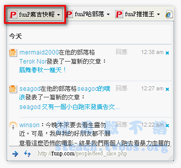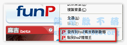 此時聞到一陣Funp的味道飄了過來,不過別急,這六個可是三種不同類型的小工具哦,右上小框框的新聞通,也就是Funp新聞通的搜尋工具列,最下面的大紅框,就是用來右鍵立即貼和立即發的右鍵加速器,剩下的3個,就是讓你把最重要的3個連結加入我的最愛列,不過也不用考慮啦,就是給他全部再次用力的點下去或是到咱們貼心的Funp也有準備好哦:由此去