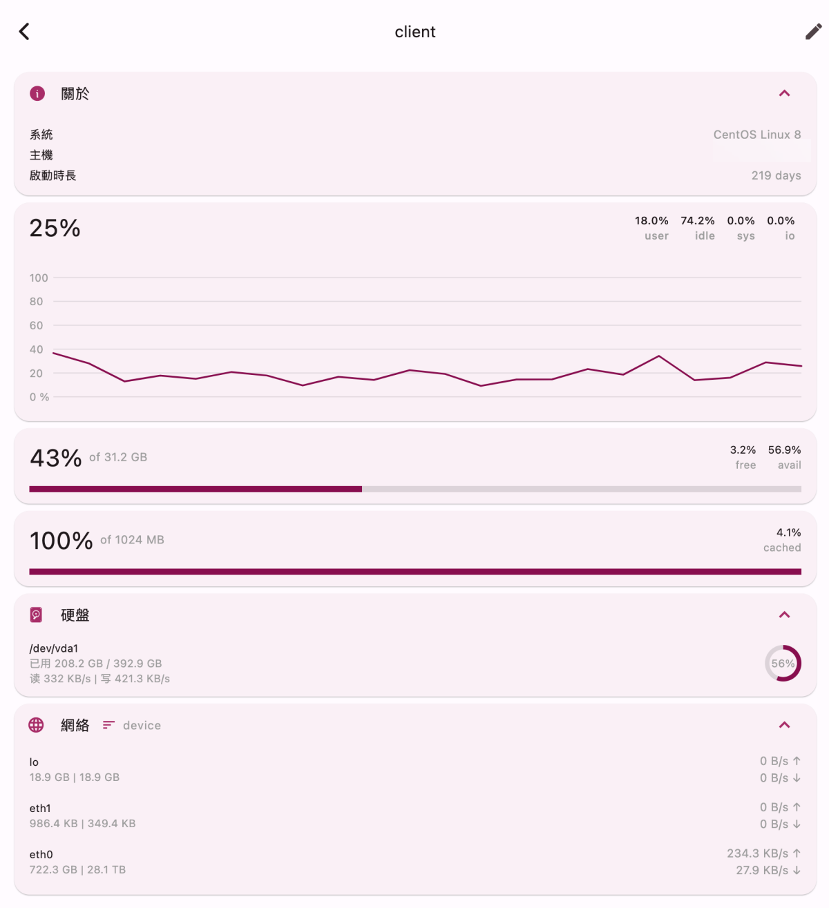 登入後除了在首頁有基本資訊外,還有像這樣的基本資訊,包括開機多久,使用率,儲存空間使用率等。