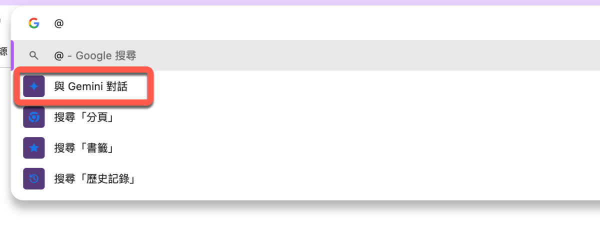 其實一般使用來說,可以直接進到 Gemini 網址使用就好,不過如果你想要更精簡一點,可以在網址列輸入「@」這個符號,就會看到下拉選單有「與 Gemini 對話」,請先點撃他。