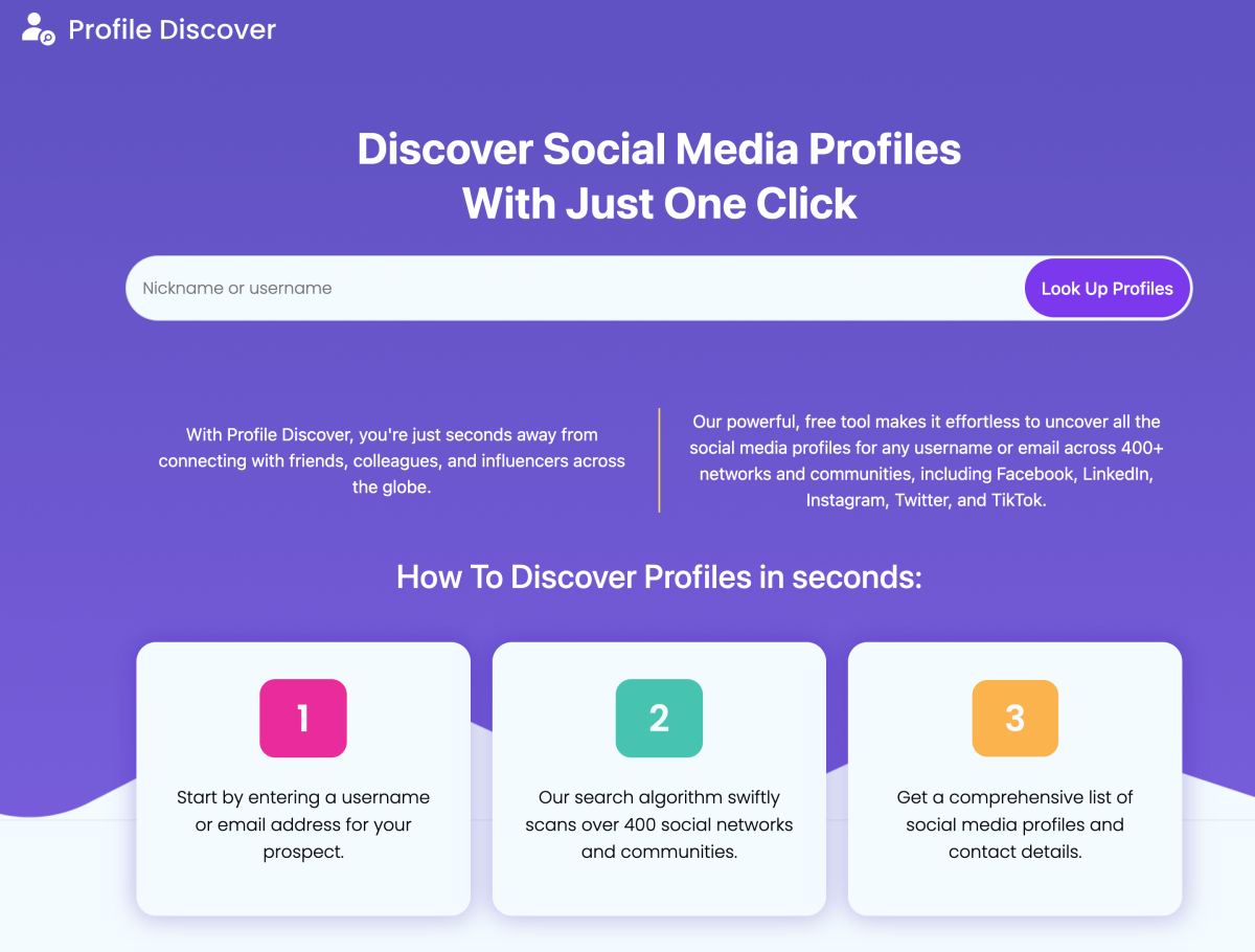 當我們想要找一個人時,現在最快的做法,除了上 Google 直接搜名字、電話、Email 外,社群網站是存在更多資訊的地方,假設你在 A 社群看到某人的帳號,想要取得更多資訊的話,一般就用他的帳號名稱再去找找 B 社群,因為大多數人的帳號都會用一樣或者類似,今天來分享一個網站叫 Profile Discover,可以用帳號名稱反查超過 400 個社群網站,搜尋你可能要找的對象。