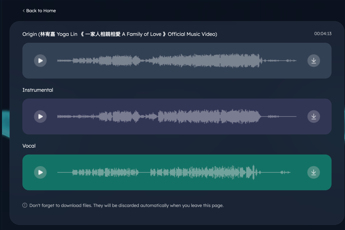 以我這首歌為例,送出後,完成轉換會有三個結果,第一個是原曲,簡單的說就類似把 YouTube 下載為音樂檔,第二個是只有音樂,也就是去除了人聲,而第三個是純粹的人聲,我試了一些音樂後,這 AI 分離的結果真的蠻完美的,比起以前使用軟體去除效果好超級多,基本上是很乾淨的。