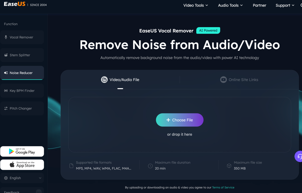 再來是降噪工具,上傳後就可以幫你將不是主要聲的雜音都去掉,如果是錄音的話也會變的更加清晰。