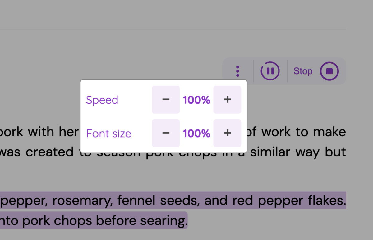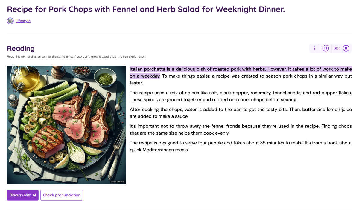 進入後會有一篇短文,點撃右上角的 Play 可以播放,AI 會唸給你聽,發音不會很機器,算是蠻自然的。