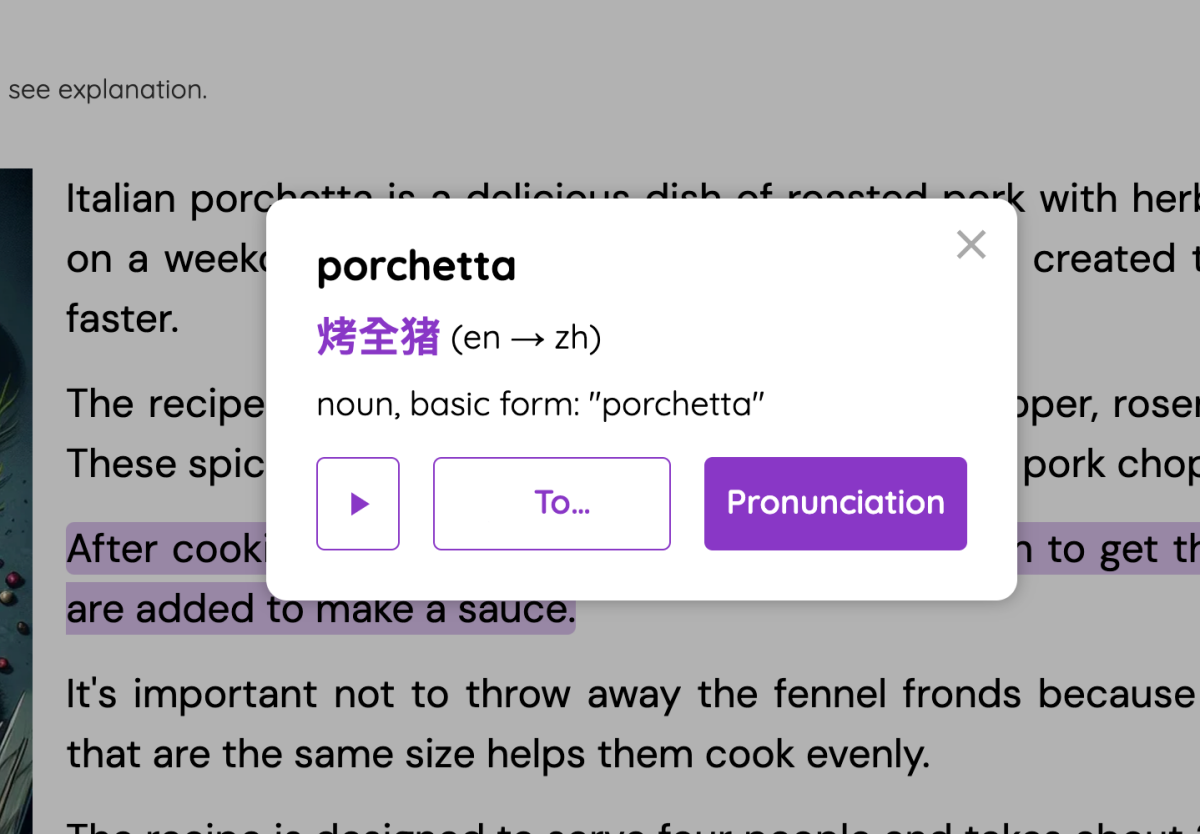 遇到不懂的單字可以直接點撃該單字,會直接顯示該單字的字義,按播放還可以聽怎麼唸,如果想要加入單字加強,按下 To... 就可以加入單字卡的概念。