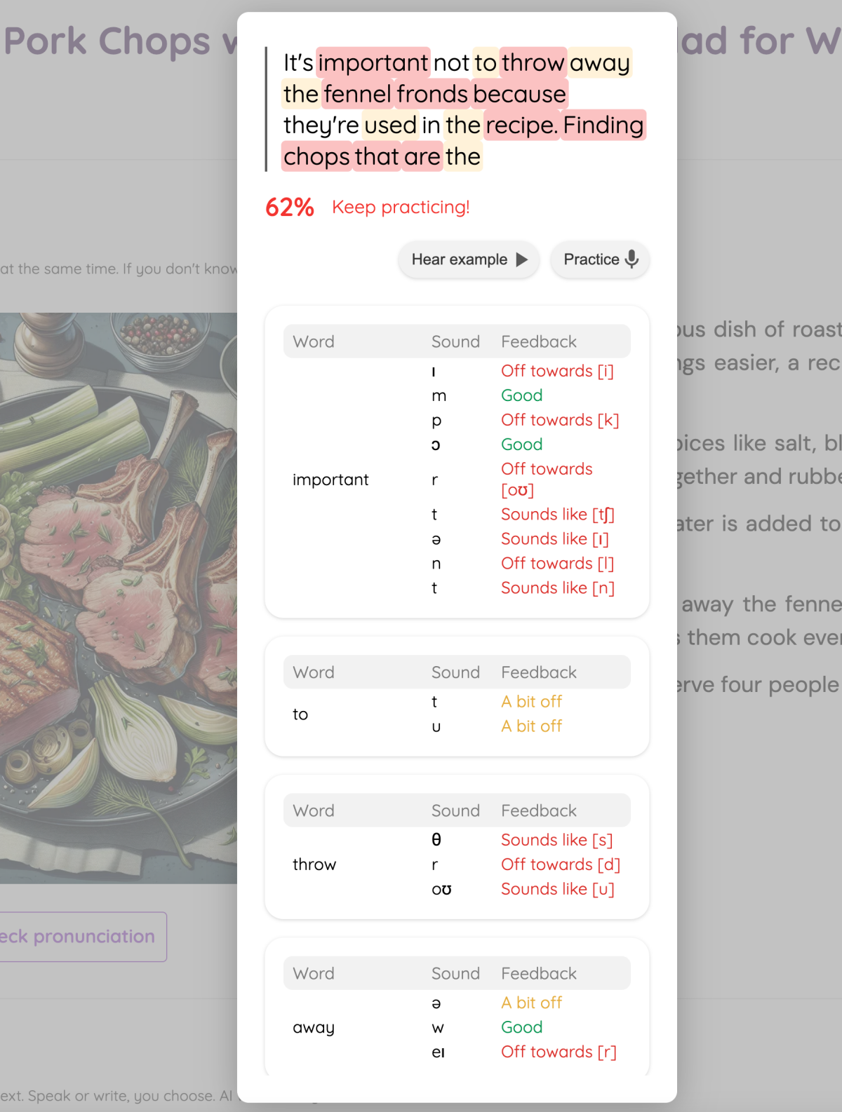 當你整篇內容反覆的熟練後,往下有個 Check Pronunciation,按下去後會有一小段內容讓你練習發音,按下 Practice 就可以開始唸給 AI 聽,他會幫你分析你的發音。