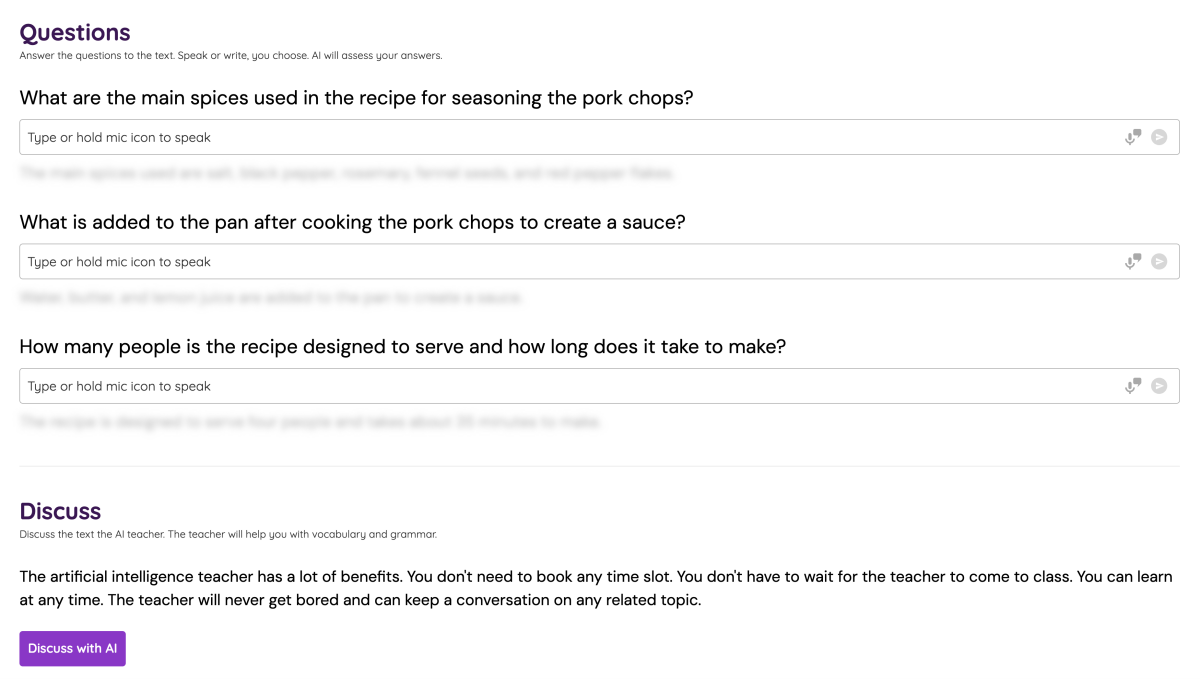 最後按下 Discuss with AI 就會跳到第二個 Talk,這功能主要是和 AI 對話,當你練習完文章後,他會想要和你討論文章的內容,會對你提出一些問題,問問你的想法、看法。