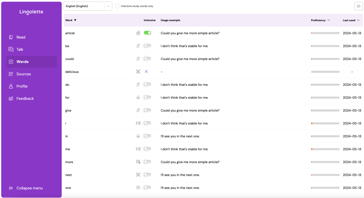 Words 裡就是單字本,可能你沒唸的那麼精準或是你想要加強練習的,都可以在這裡看到。