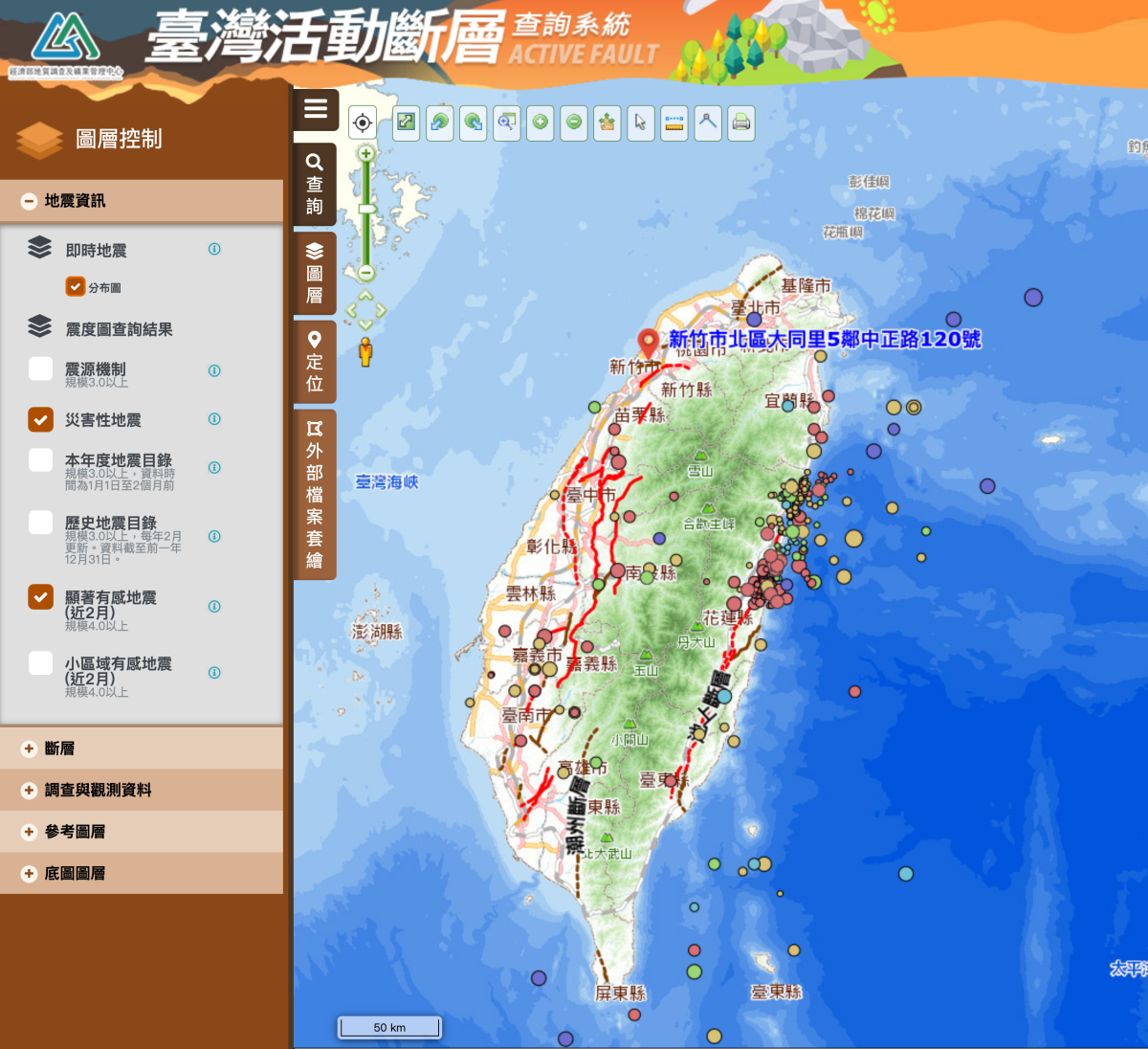 經濟部地質調查及礦業管理中心就提供了一個臺灣活動斷層查詢系統,讓我們可以快速的在這裡查詢全臺斷層的分佈,而且你想知道離你家最近的斷層在哪裡也只要輸入大約地址就搞定。