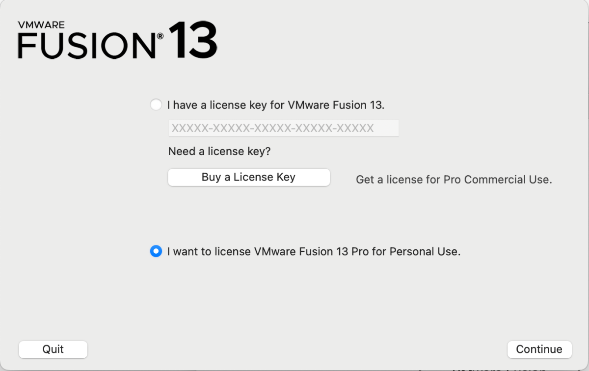 在安裝過程中,如果你是企業使用的話,當然就要購買序號,個人使用直接選擇第二個「I want to license VMware Fusion 13 Pro for Personal Use.」,就可以直接免費使用。