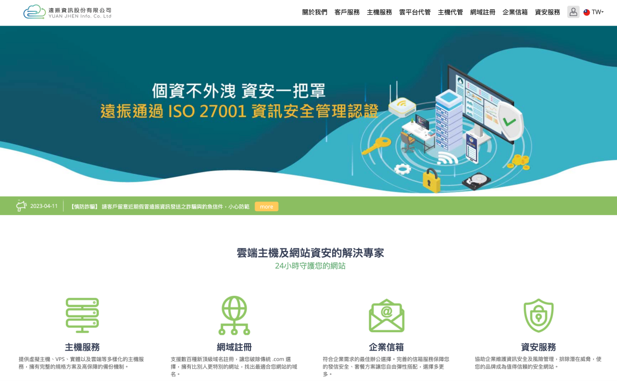 說起遠振資訊,我在 15 年前第一次建立我的部落格時就是用他們家,我記得當時還叫做 G 型主機,後來才正名為遠振資訊,而這 15 年來的規模也愈來愈大,可以選擇的方案也愈來愈多,不論是主機服務、網域註冊、企業信箱代管或是資安服務通通都有,而且還有通過 ISO 27001 資安管理認證,這非常的重要,選擇穩定、安全的主機服務商,比起價格半價再半價的菜市場主機來的重要太多太多了。
