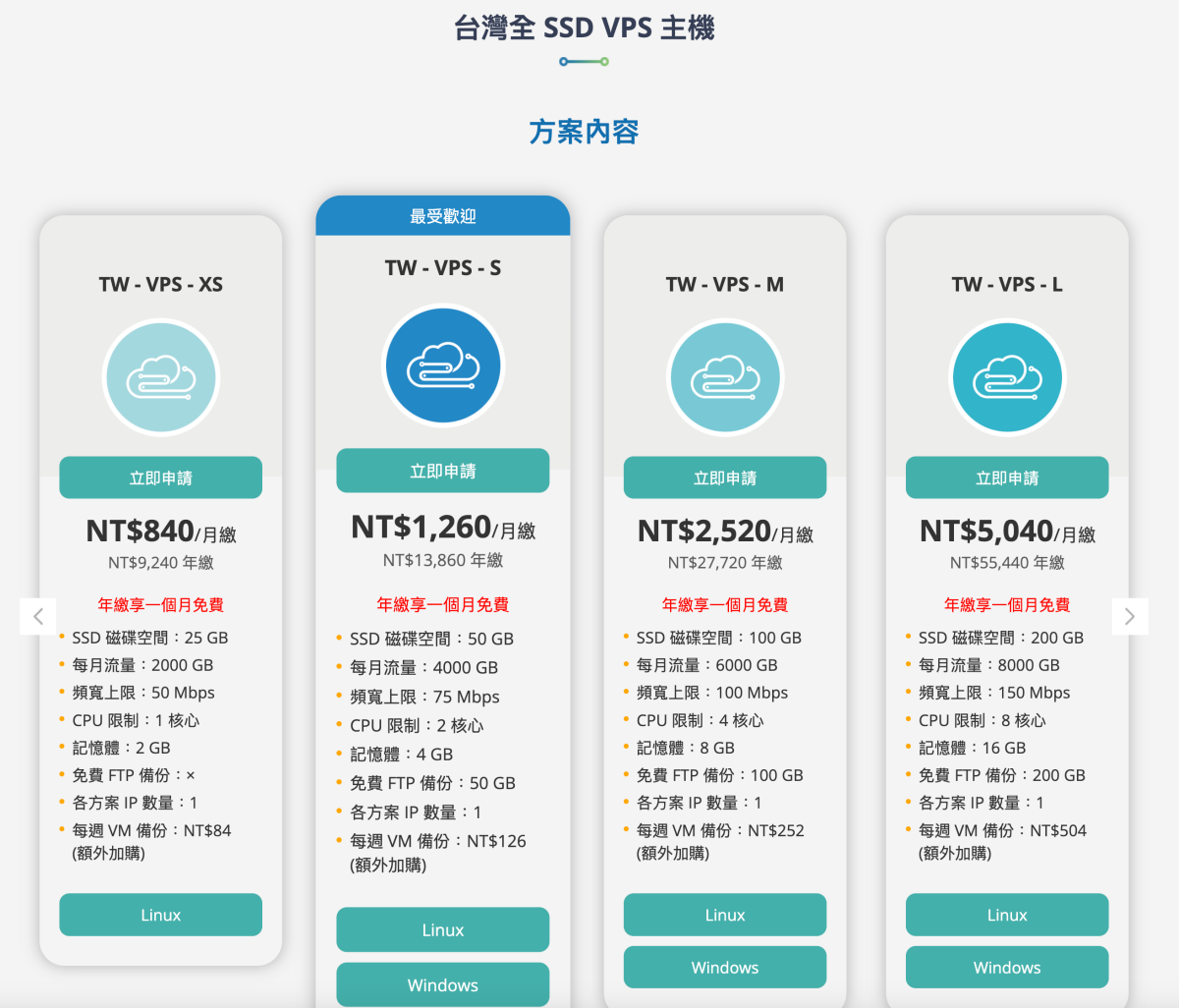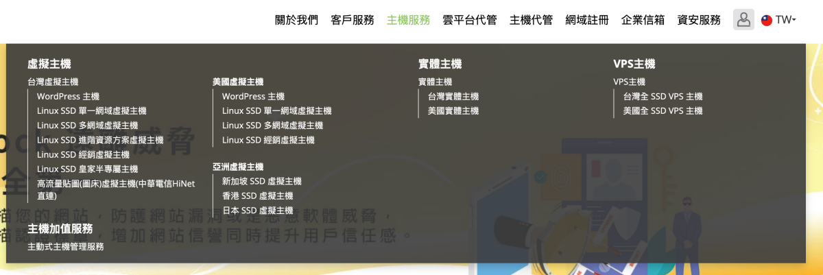 單就主機服務的部份就包括了虛擬主機、VPS 以及實體主機,每個方案中還有區分不同地區的主機服務、主要是台灣及美國,而且虛擬主機跟 VPS 基本上都已經改用 SSD 了,因應不同需求,都有對應的主機及方案可以選擇,如果真的沒有,嗯..... 那就寫信去跟他們討論不同的企業方案,肯定也能符合需求的。