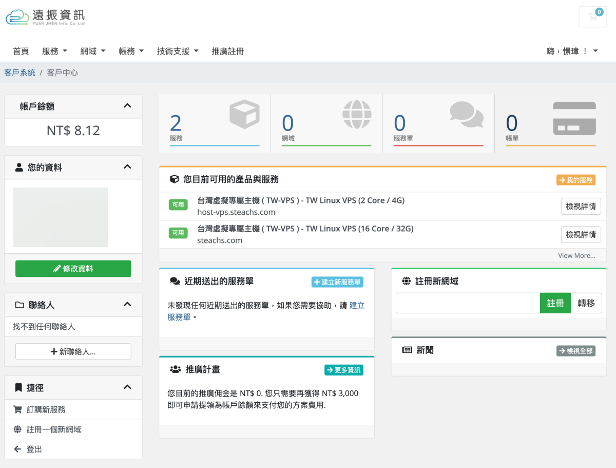 因此在用過各家主機服務後,最終我還是回到了遠振資訊的懷抱,真的是很好用,而且服務的品質跟效率都很不錯,包括我手邊有一些客戶也都選擇了遠振資訊的主機服務,用了好幾年都沒有任何問題,最近有在考量主機該何去何從的朋友,不妨來試看看遠振資訊提供的服務吧。