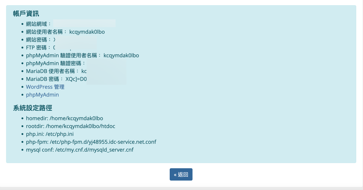 最後安裝完成後會提供你相關的帳密及管理資訊,唯一小可惜的是,不能在安裝時就先選擇好網站網域,如果可以先設定就完美了,不過既然要用 VPS 了,基本概念還是會有的,改個網域名稱問題肯定不大的。