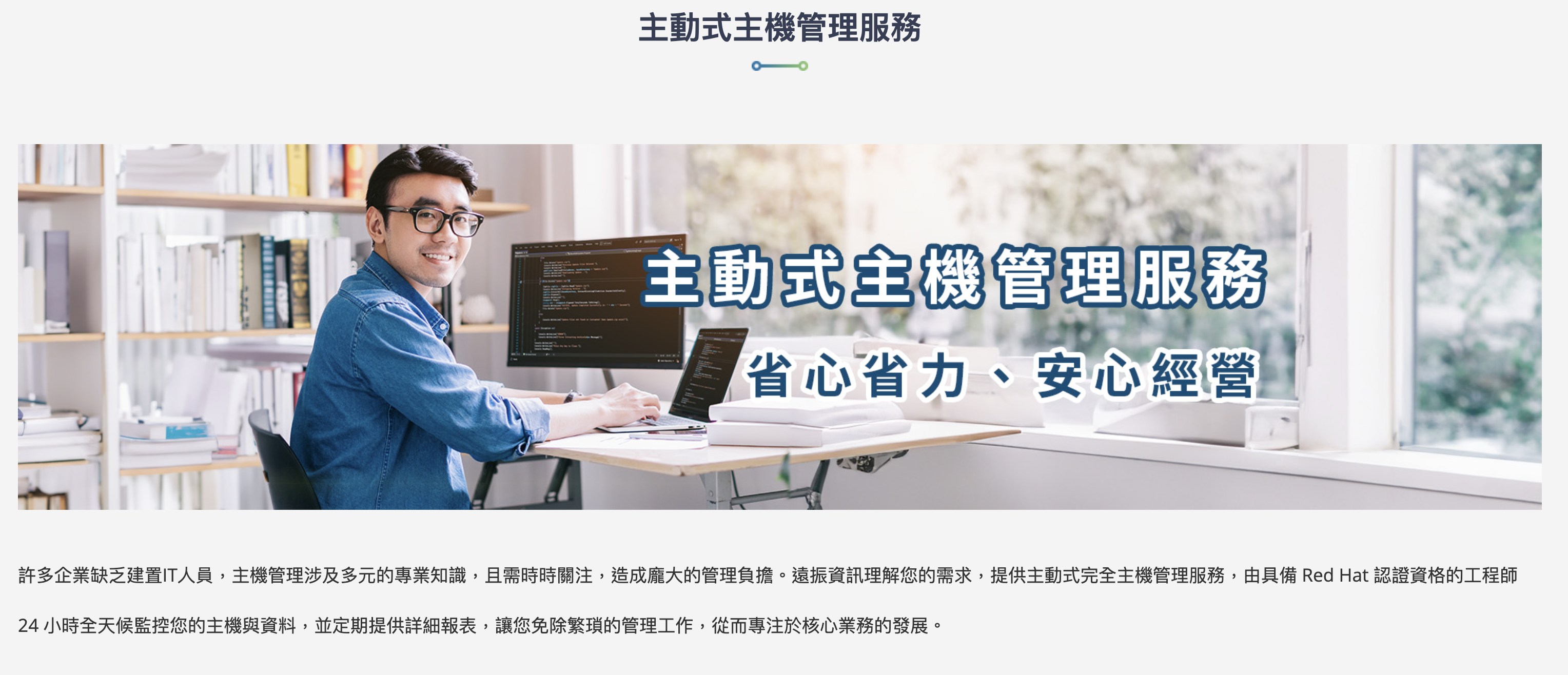 不過建議要使用到 VPS 的朋友還是要略懂一些相關技術,畢竟 VPS 與虛擬主機不同,要懂的還是要多一些,或者你也可以委託遠振資訊的主動式主機管理服務,就算你不懂技術也沒關係,由他們提供 IT 協助,一個月只要 4 千元起,比你自己養一個工程師每天吃便當都來的划算太多了。