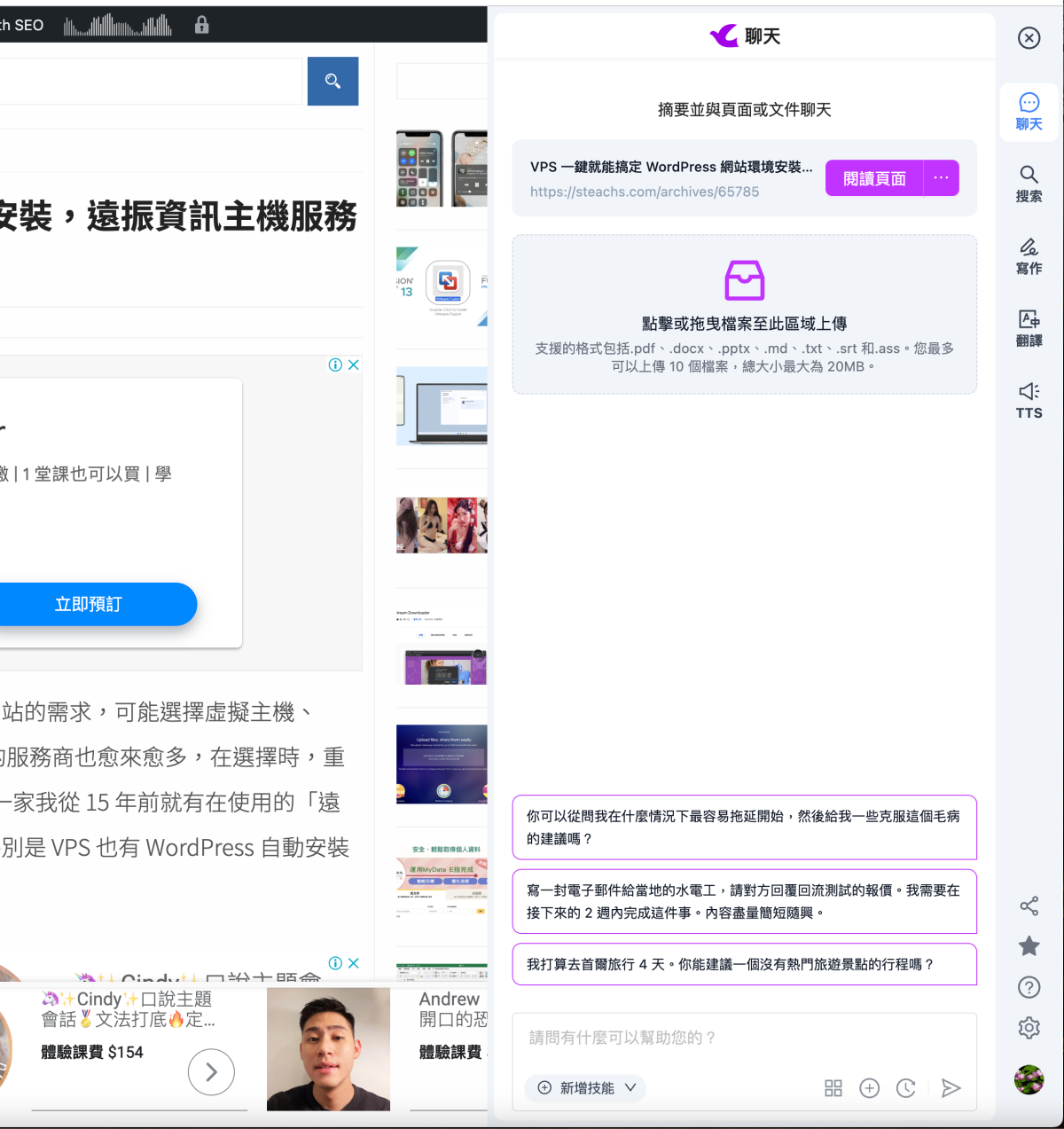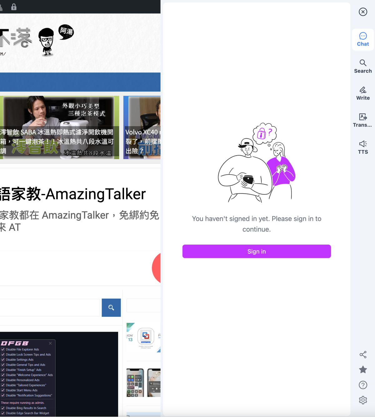登入後右邊就有聊天、搜索、寫作、翻譯跟 TTS 的功能可以使用,而大家透過 AI 助理最常用到的功能差不多就這些了,如果有一些專業圖表或是相關的需求的話,那麼可能還是要用訂閱版的 ChatGPT 搭配對應的外掛來使用。