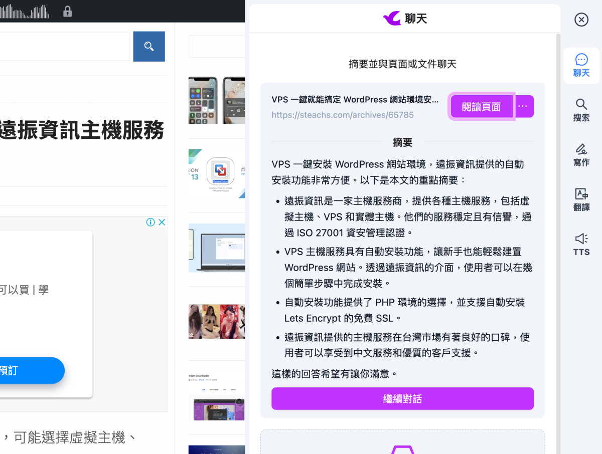 阿湯就簡單的帶一下功能,其實使用上還有很多應用,像是 YouTube 的影片摘要,如果影片有附 CC 字幕,他會去讀取字幕的內容幫你摘要內容,還會整理重點,除了原本就可以詢問 ChatGPT 的功能外,還有像是可以連上網路搜尋資料也能達成,整體來說,以免費的 AI 助理,目前 TinaMind 我覺得是最強大且最好用的一款了。