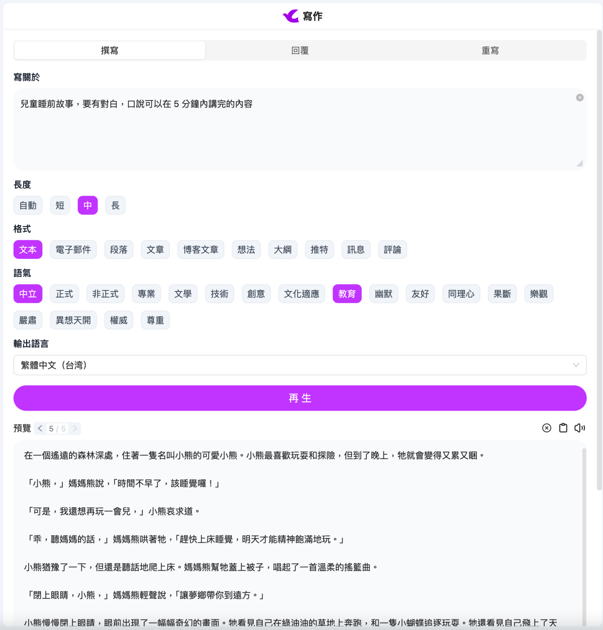 功能我就不一一的介紹,大概來講一下寫作的部份,你可以按照需求提出後,他會照你的提示開始寫作內容,產生的結果我覺得還算不錯,如果你想要更有細節或生動一些,只要在指令的部份再多描述一些就好。
