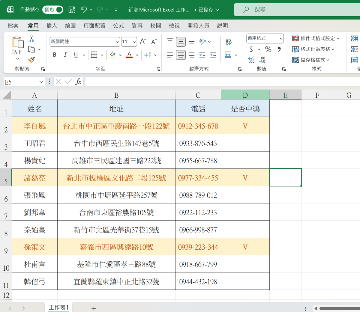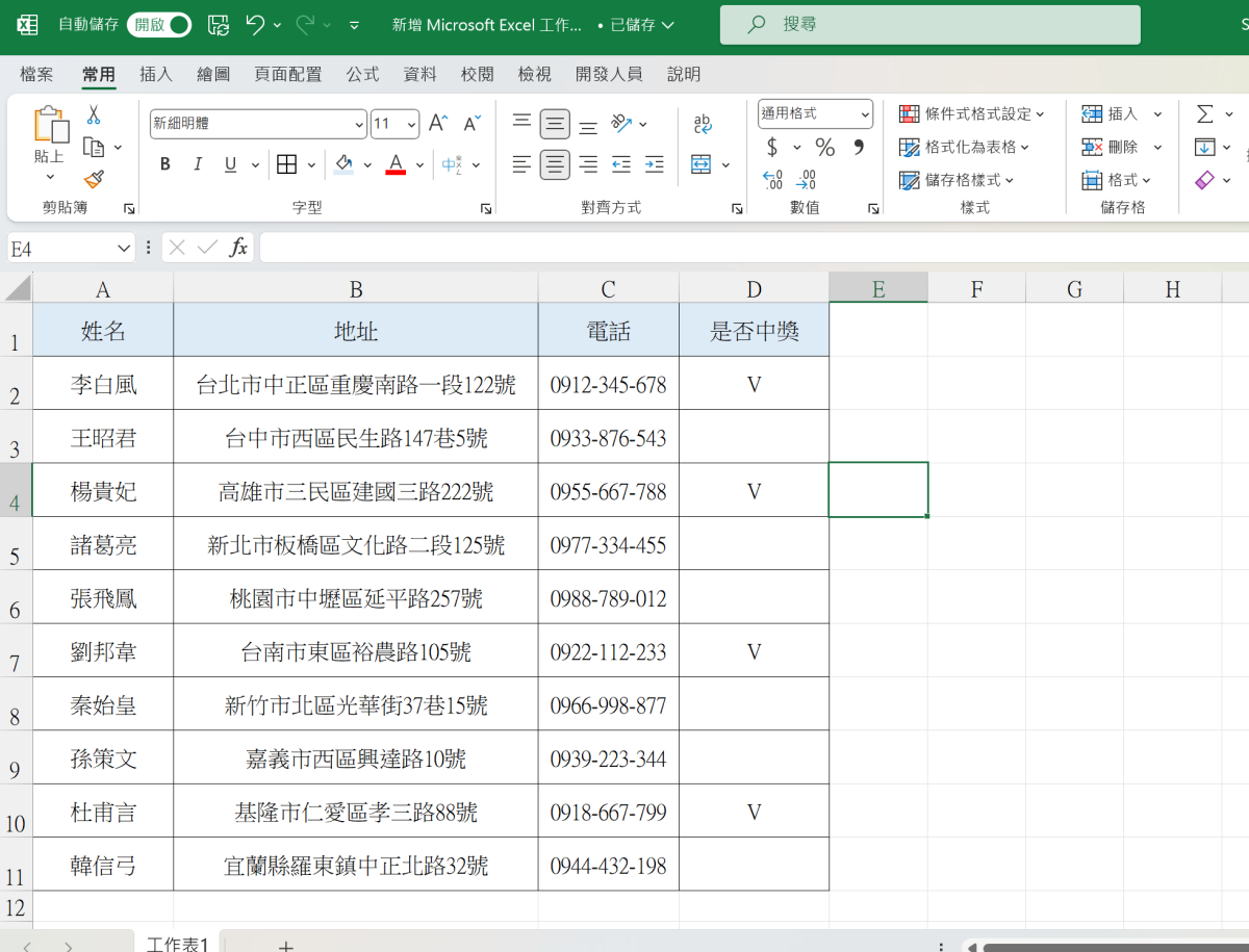 首先,來舉個簡單的例子,當我們有一個表格資料時,比如下面的例子是將中獎的勾選標示出來。