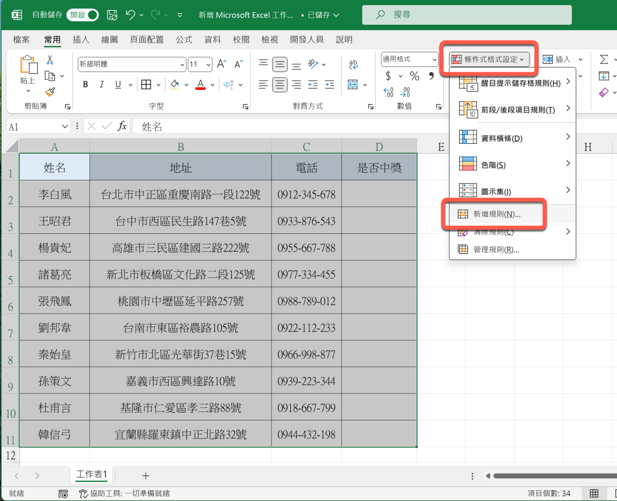 這時我們需要依靠「條件式格式設定」這個功能,讓我們更有效率的達成需求,先選取整個資料內容,然後上方選擇「條件式格式設定」>「新增規則」。