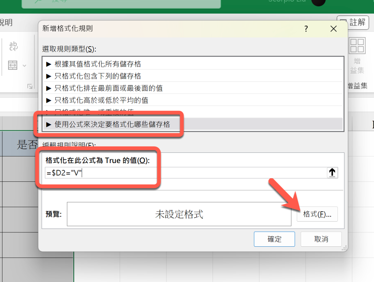 選擇「使用公式來決定要格式化哪些儲存格」,然後在下方格式輸入公式「=$D2="V"」,大概說明一下,D2 是填入是否中獎的第一欄,用 $ 符號固定 D 這個值,2 不用固定,要讓他自動往下套用,再來後面的 ="V",在雙引號中間的值就是你要判別的值,當 D 欄是 V 時才去執行要變更的格式,而要變更的內容,我們可以點撃右下角的「格式」。