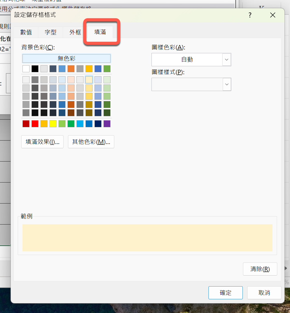 如果你是想要加入底色,就是切到填滿,然後選擇色彩、樣式等。