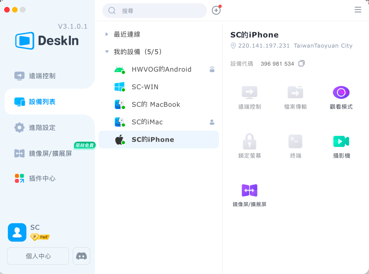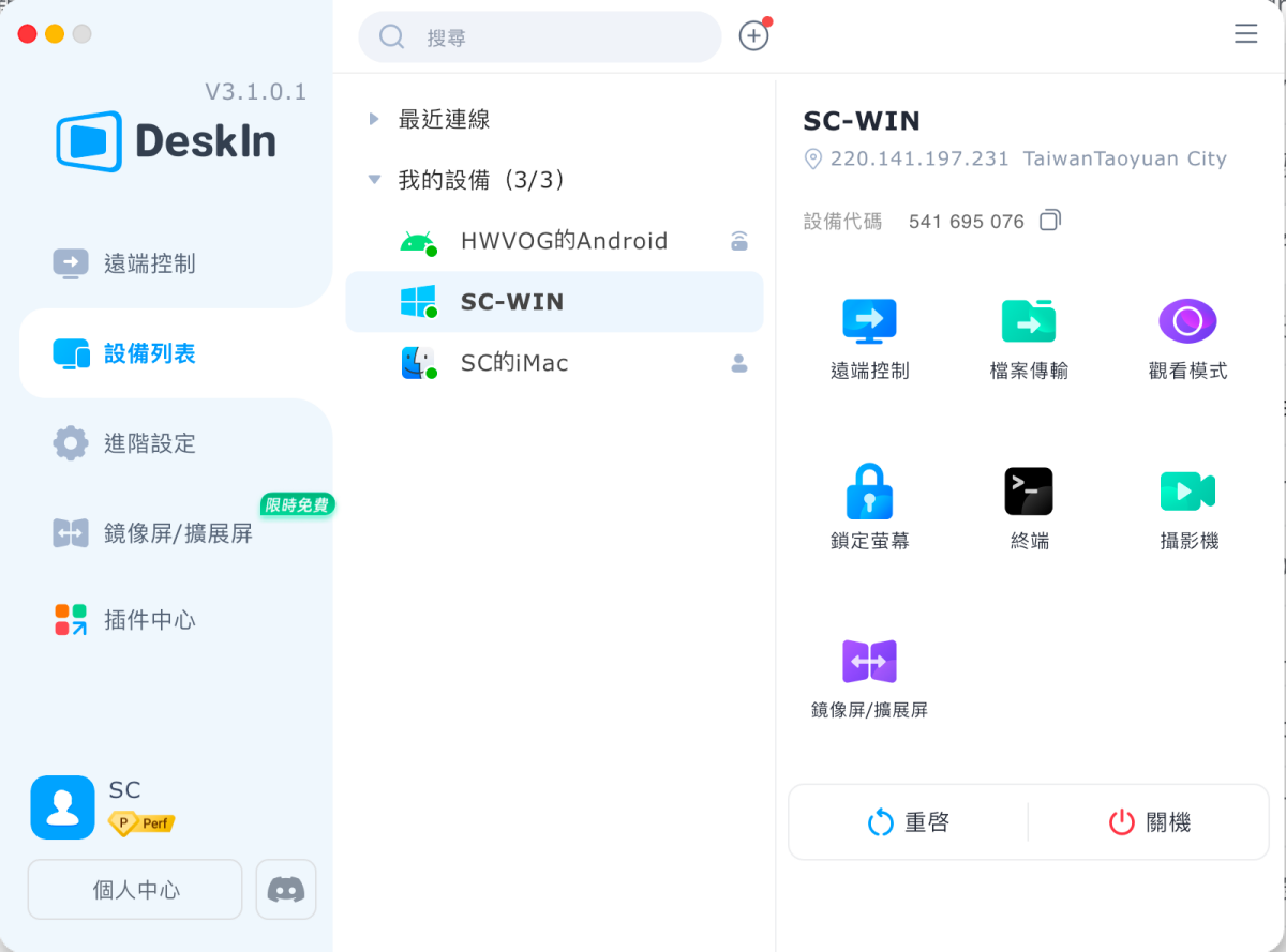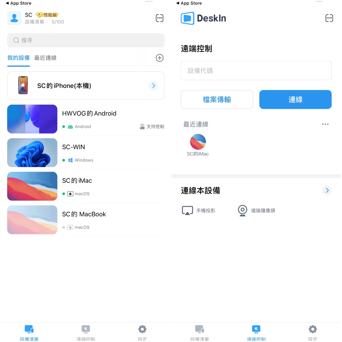 設備列表的部份,只要有登入相同帳密的設備,在開啟 Deskln 的情況下就會顯示在這裡,像我家中的電腦就都會隨時開啟,這樣在外面時,臨時需要家中電腦的什麼檔案,就可以直接連進去傳輸,或者像臨時需要其它工具來使用時,也能透遠端軟體來操作使用,就像在手機上裝了一台電腦的感覺。