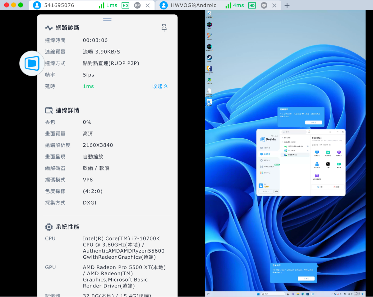 一般遠端連線時,畫面開始卡頓,你唯一猜測的就是網路不穩定,不過像 Deskln 直接就有網路診斷可以即時查看,就知道哪一個環節出了問題,這一點真的很貼心。