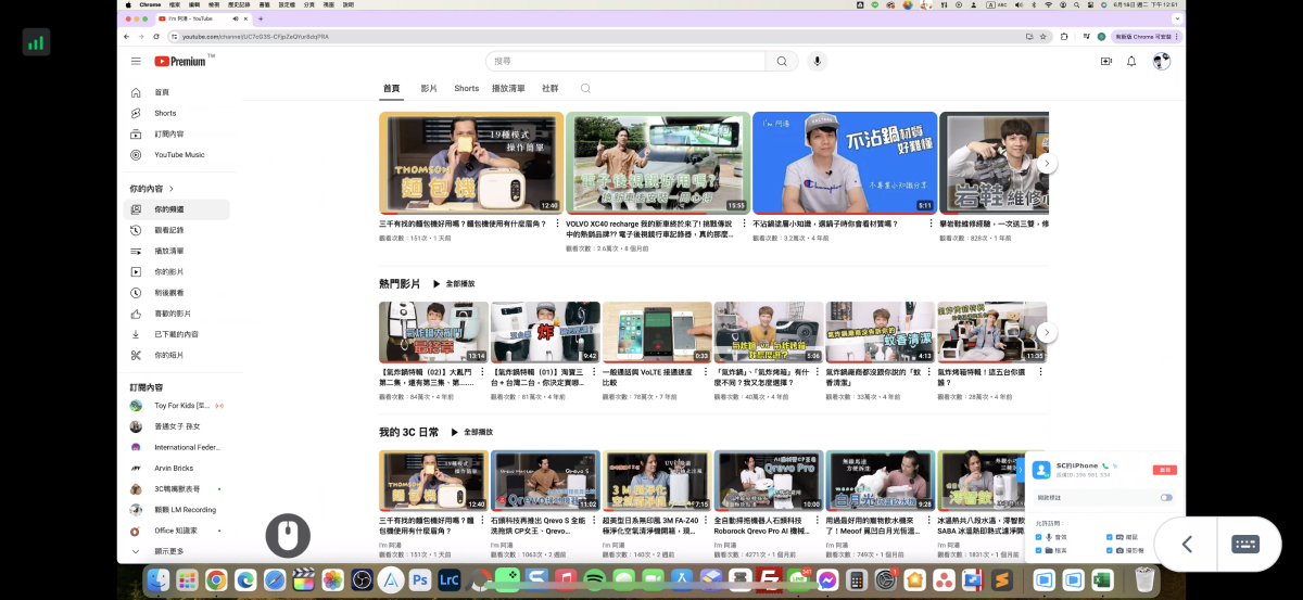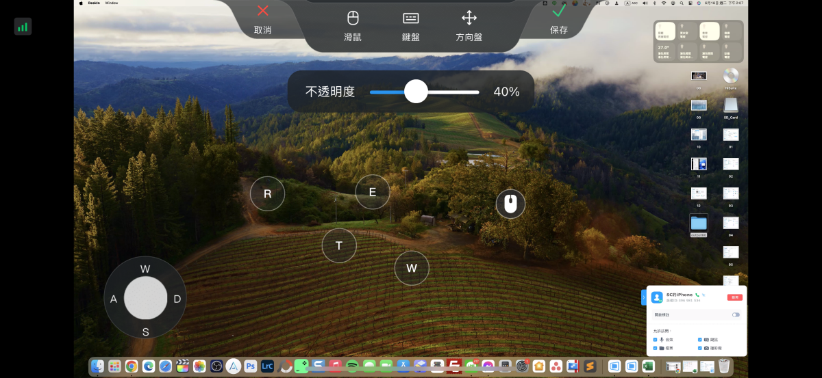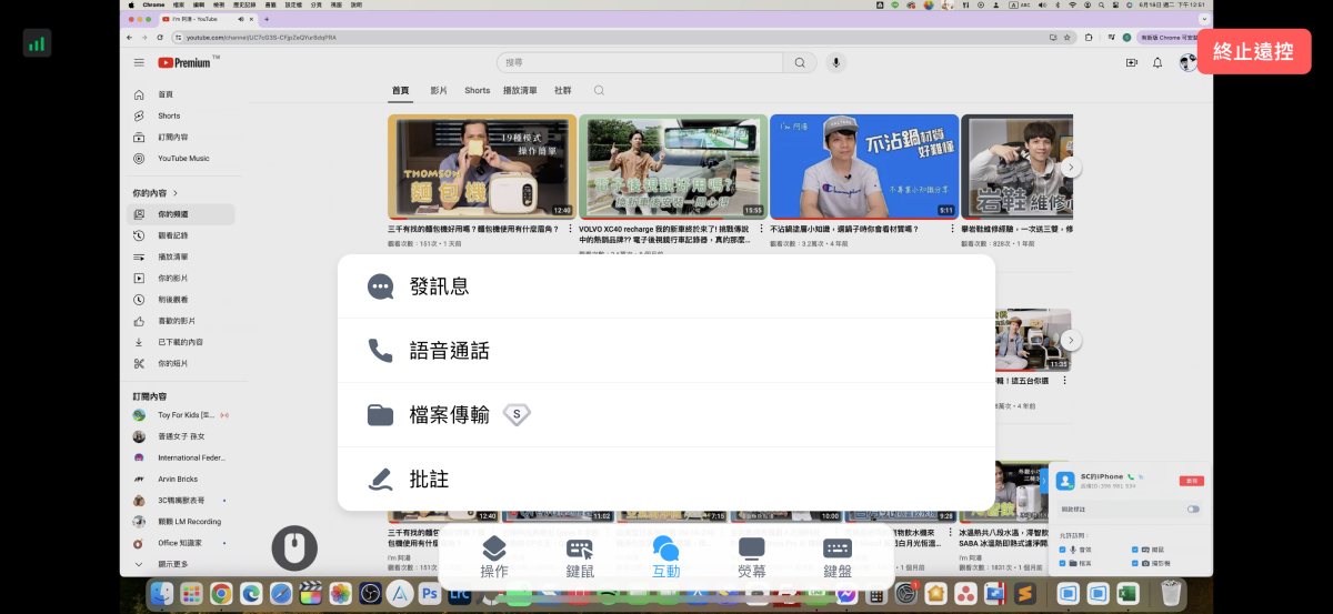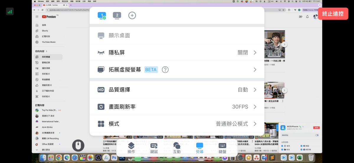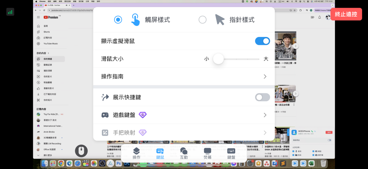 如果是手機連到電腦的畫面像這樣,這是從 iPhone 連到 iMac 電腦,預設是像平板一樣的操作方式,直接觸控就好,但因為手機比較小,所以我自己慣用平板來進行遠端連線,就會變的很像是觸控的 MAC 電腦。