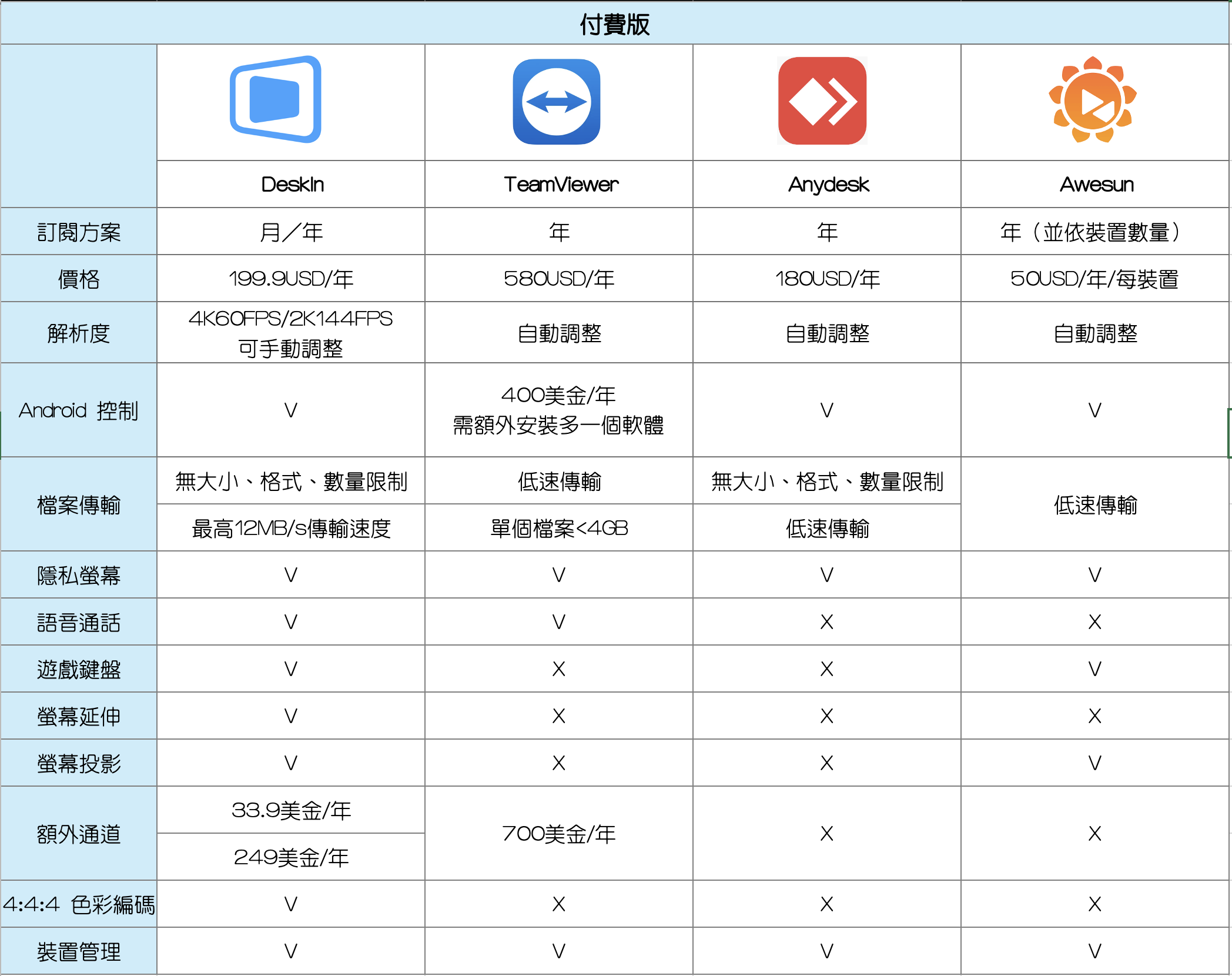 而選擇上我們主要看幾個部份,解析度、Android 控制功能、檔案傳輸相關限制跟螢幕相關功能,特別是解析度跟 Android 控制,不論免費或付費這都是很重要的參考要素。