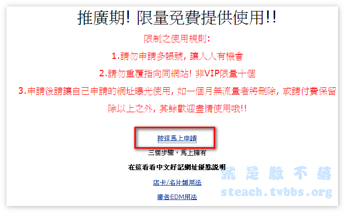登入後往下拉,首頁會霹靂叭啦介紹,點擊〝按這馬上申請〞