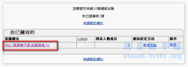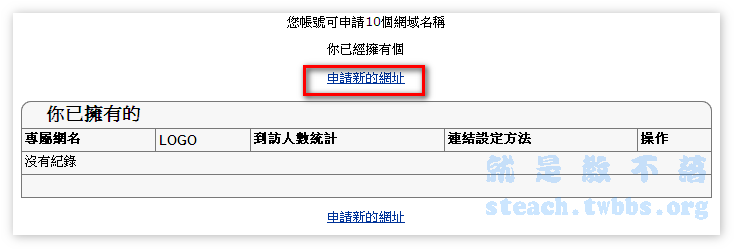 總共可以申請10個網域名稱,點擊〝申請新的網址〞