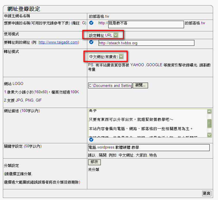 接下來一樣依照各欄填寫,第一欄即為你要的中文網址