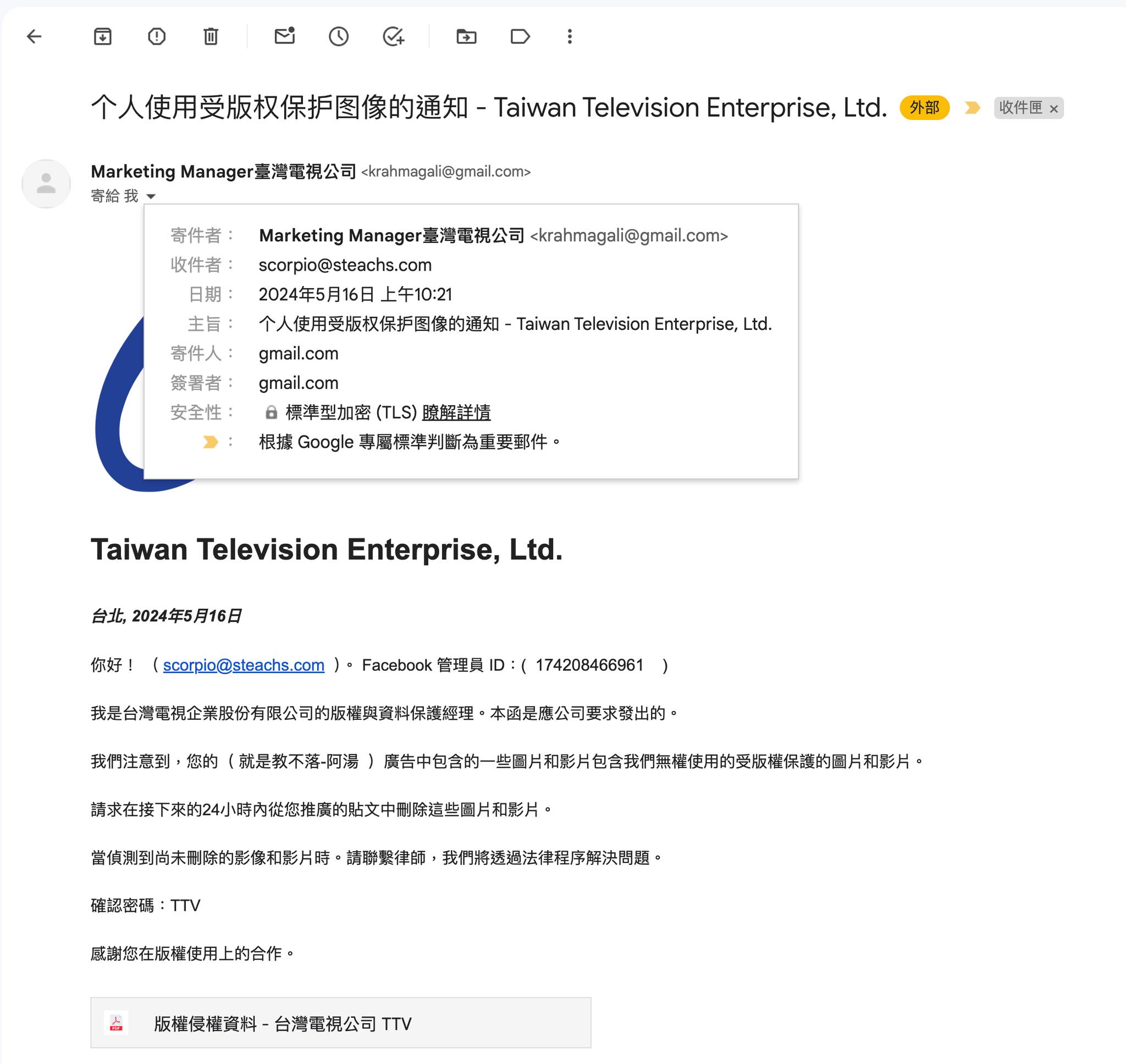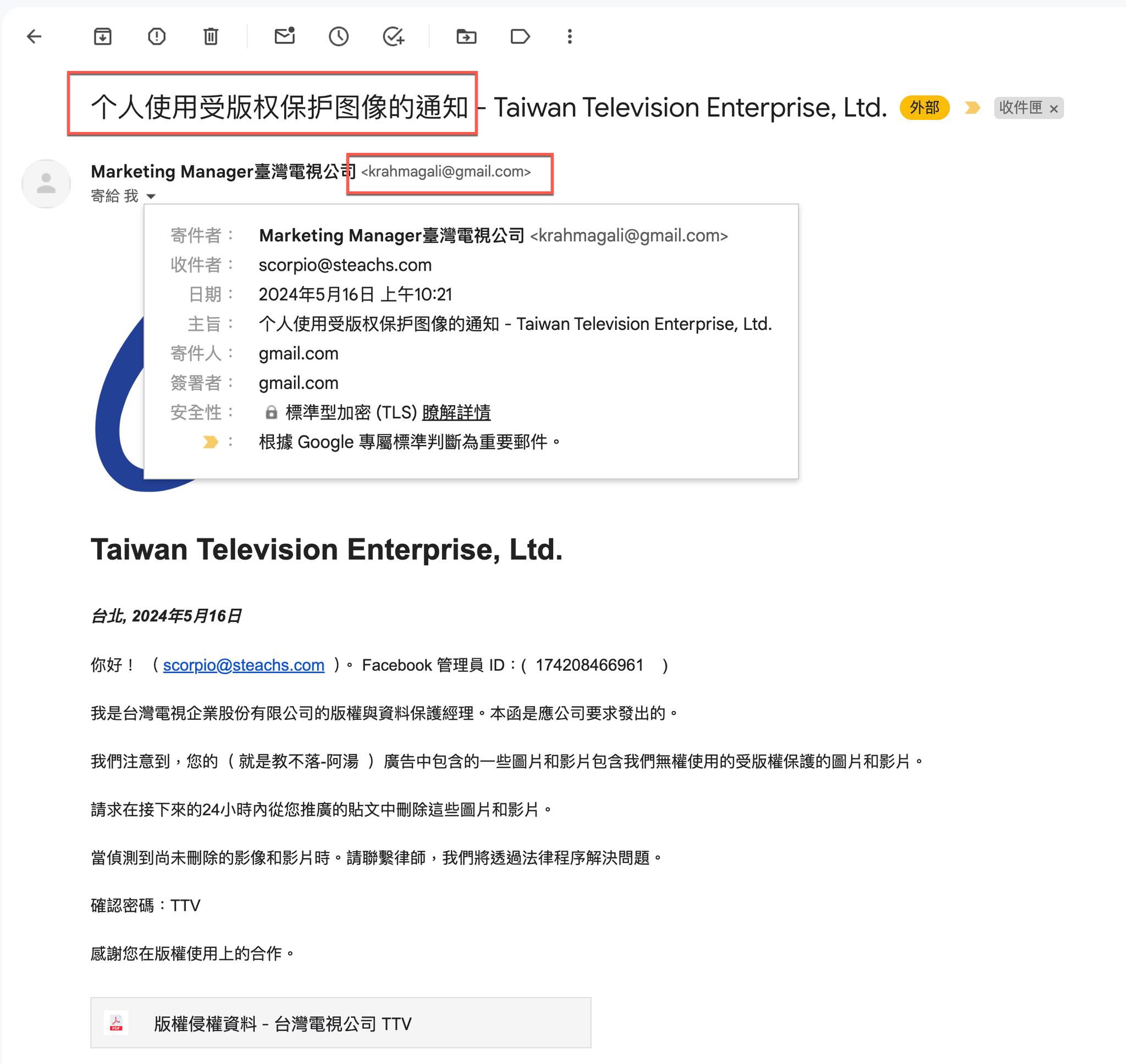 那麼要怎麼去檢查信件的真偽呢?我們分為幾個部份來看,首先,我們前面就提到了,主旨是簡體字,原則上台灣的公司不太可能用簡體字寄給你,再來最重要的一個部份,不論你是收到偽裝哪一個官方平台的客服,「務必要」查看 Email 資訊,像這由台視寄來的信,理論上要用台視公司的 Email 才對。
