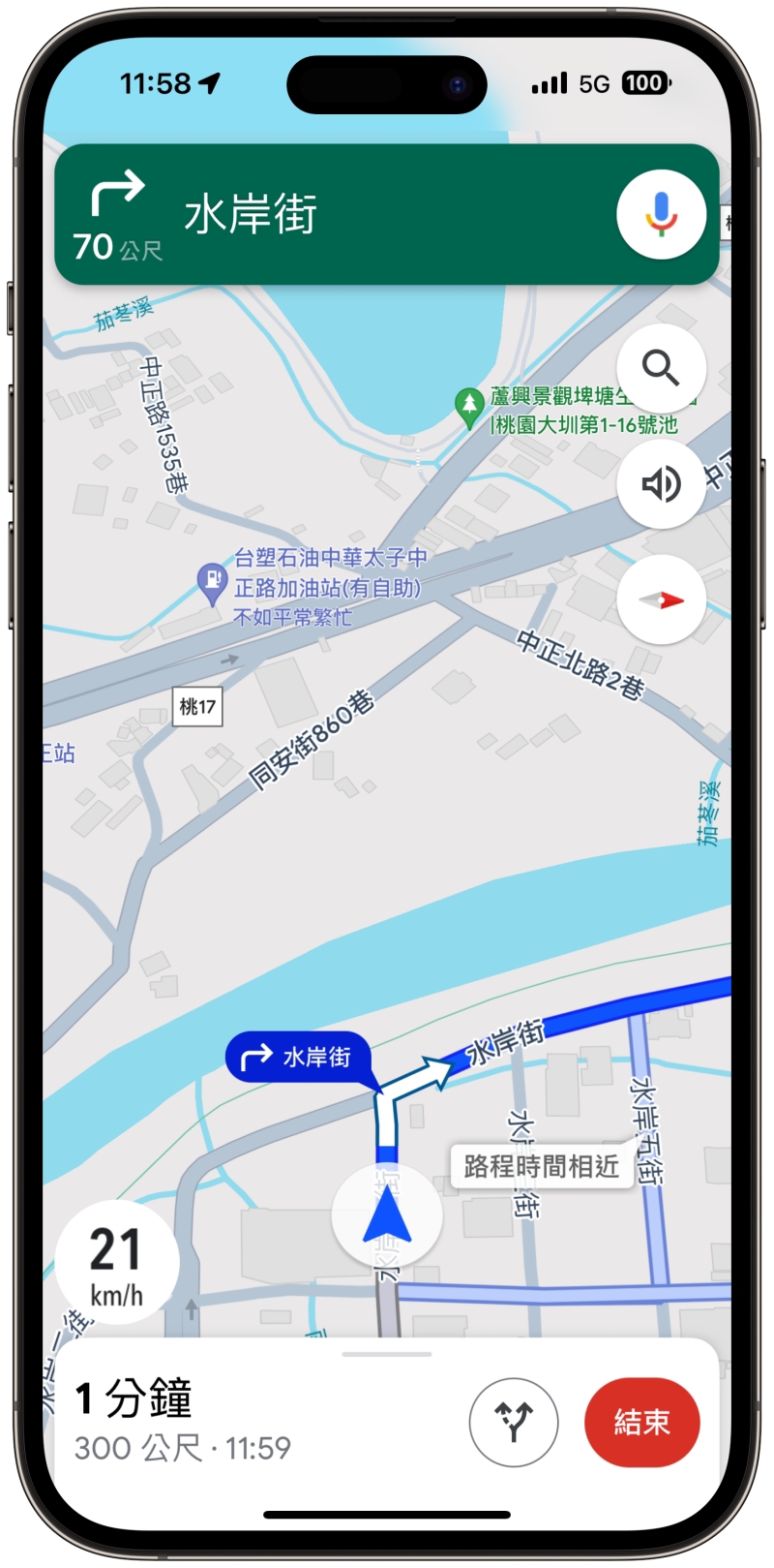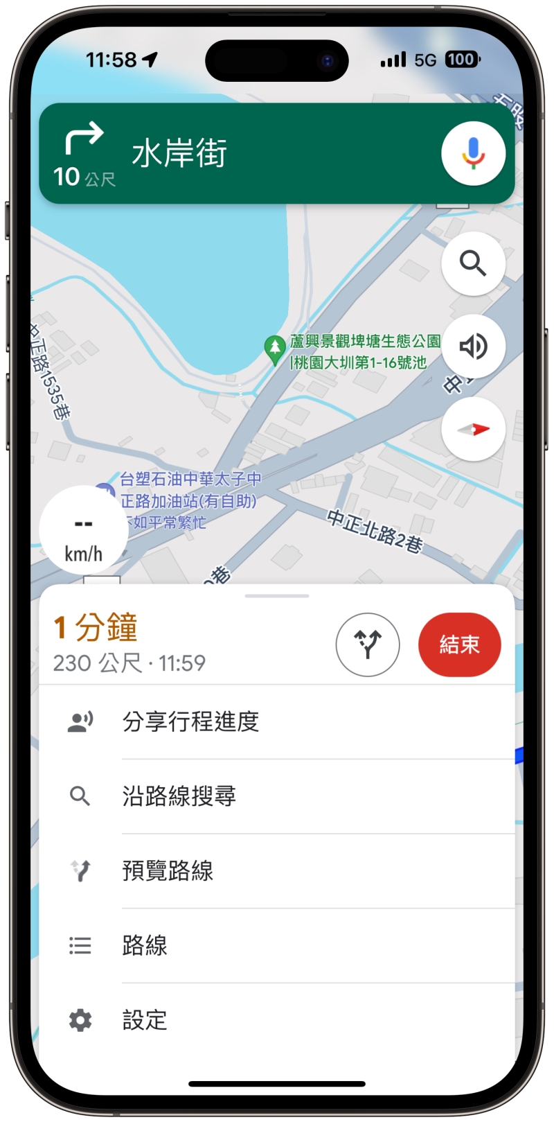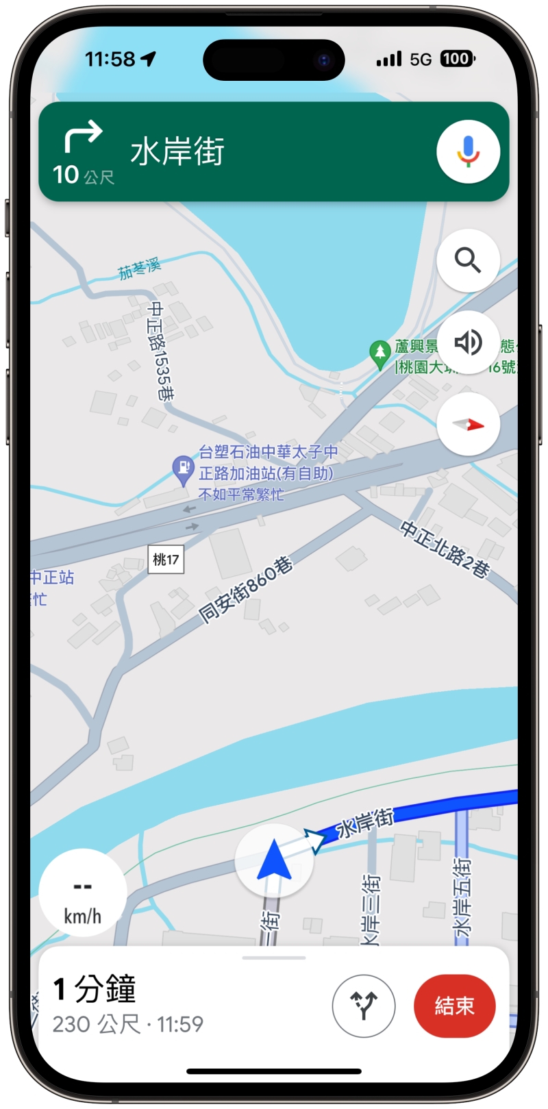 預設導航你可能還是不會看到左下角的時速表,或者像這樣沒數字,代表你是靜止狀況,或是沒開啟這項功能。
