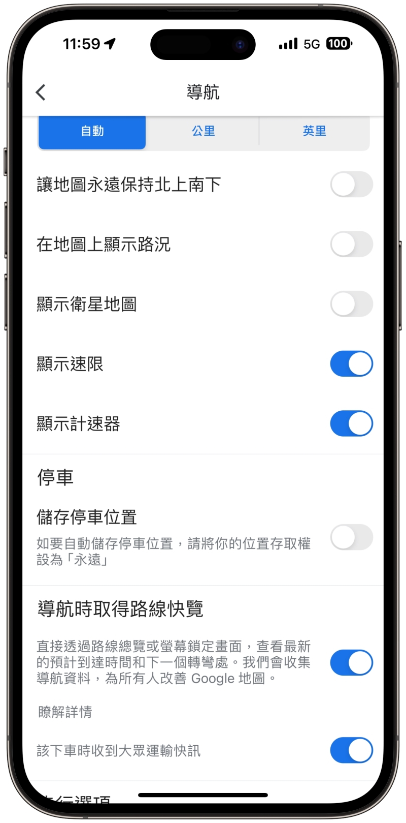 拉到最下方就會看到二個功能,一個是顯示速限,另一個是顯示計速器,可以將他們都打開,然後再去試看看,如果沒看到這二項功能,那就代表還沒輪到你,不過理論上應該都已經差不多都推送到了,記得要更新 App 哦。