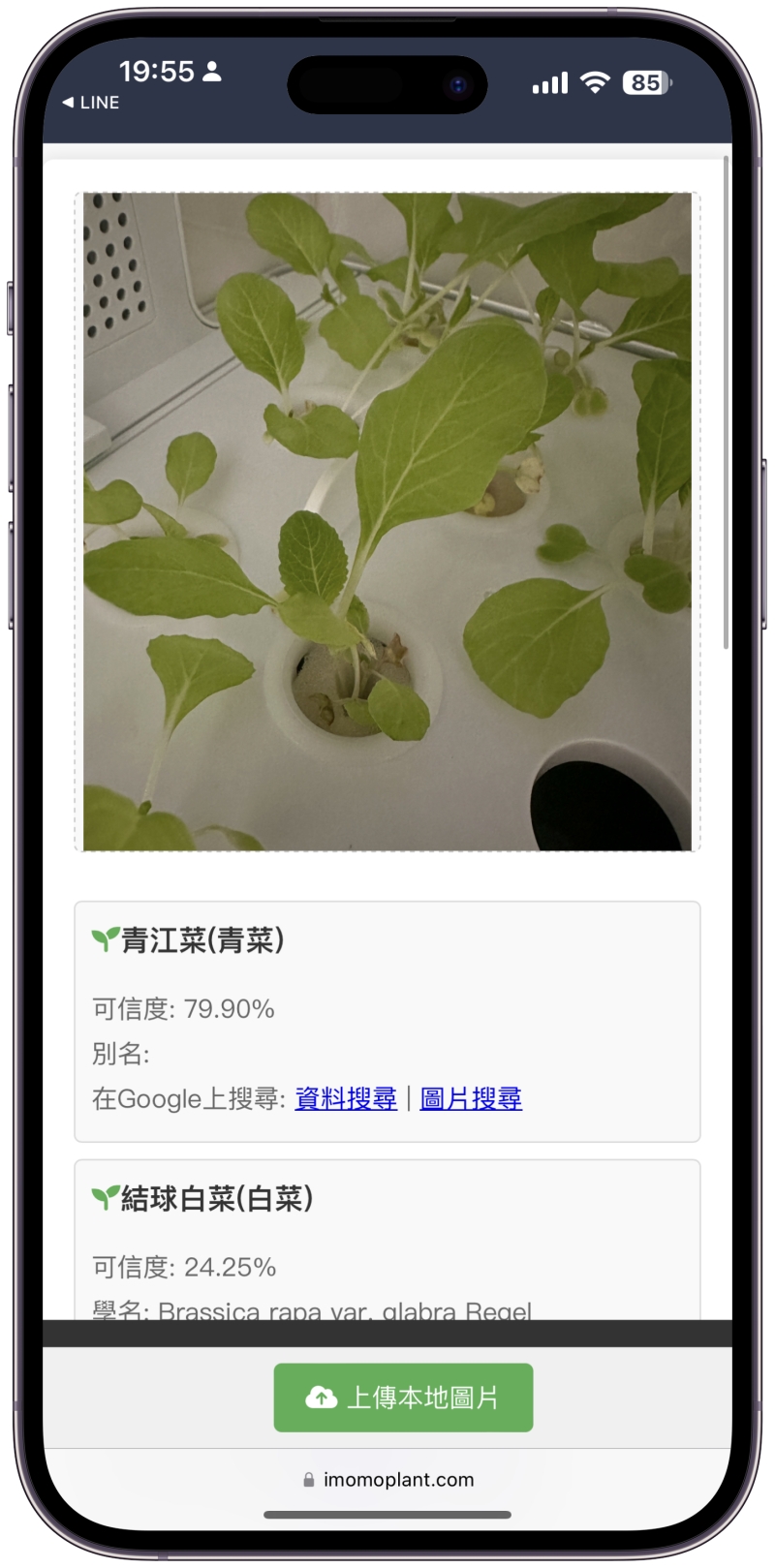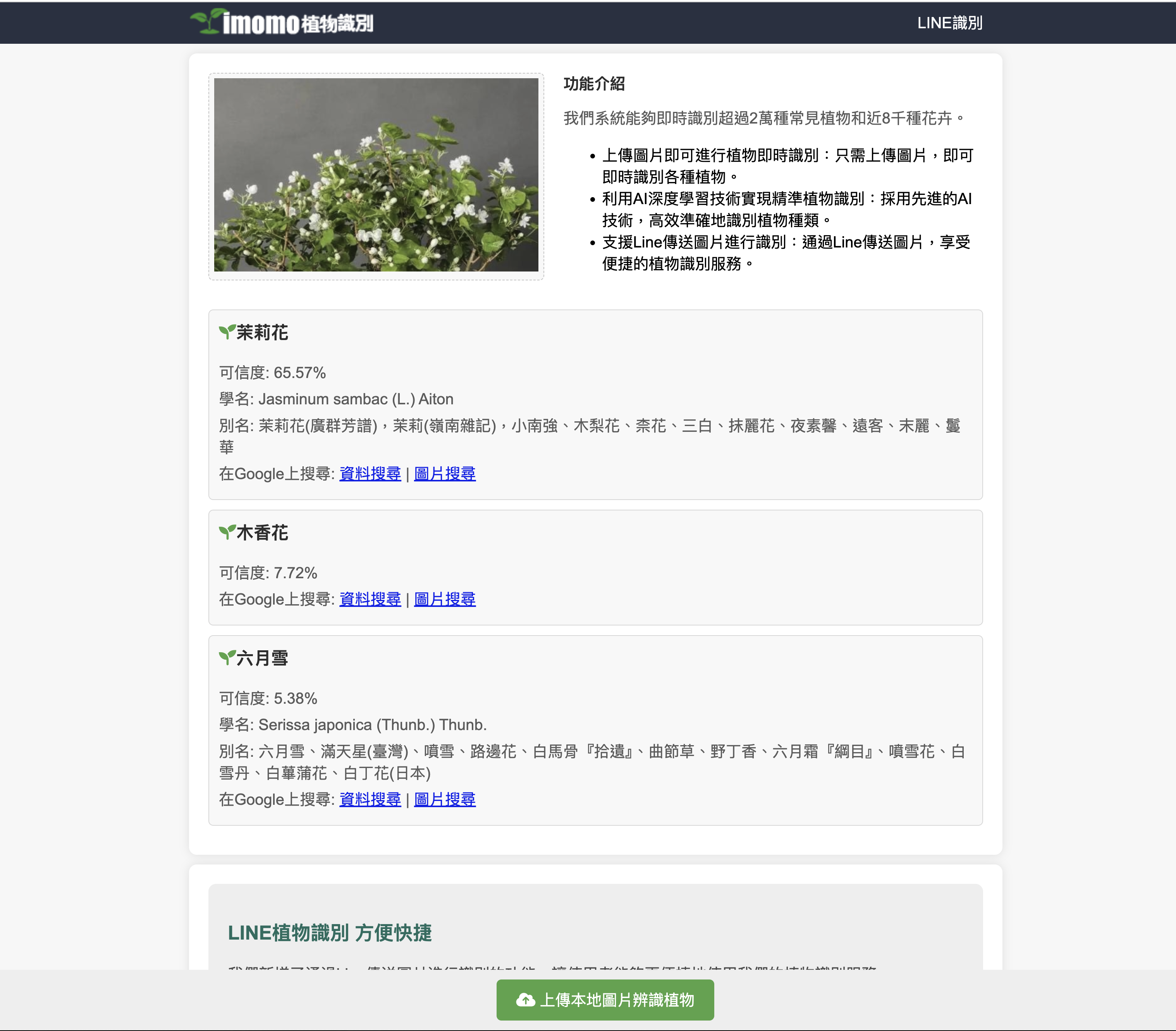 加入後直接在他們的官方帳號上傳植物照片就可以了,上傳後辨識出來就會顯示查詢的結果連結給你,這也是比較可惜的,如果可以直接在 LINE 上回覆結果就更棒了。