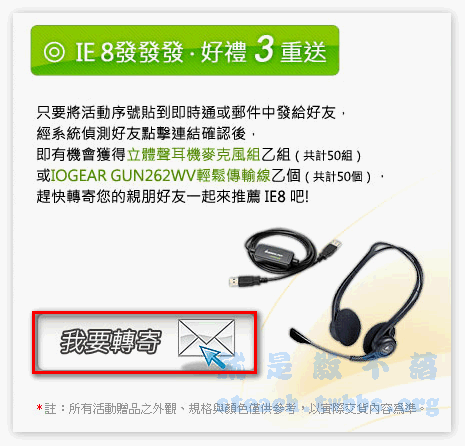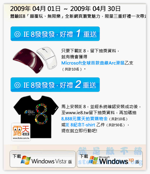 IE8官方首頁: http://www.microsoft.com/taiwan/promo/ie8/ IE8下載頁面: http://promo.ie8.tw/download/ 抽獎活動辦法:http://promo.ie8.tw/rule/獎品雖然不是什麼高檔貨,但也是加減抽,因為微軟那個滑鼠也是不錯低! 如何參加抽獎? 第1重: 在下載頁面最下面選擇你的作業系統點擊下載