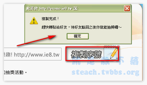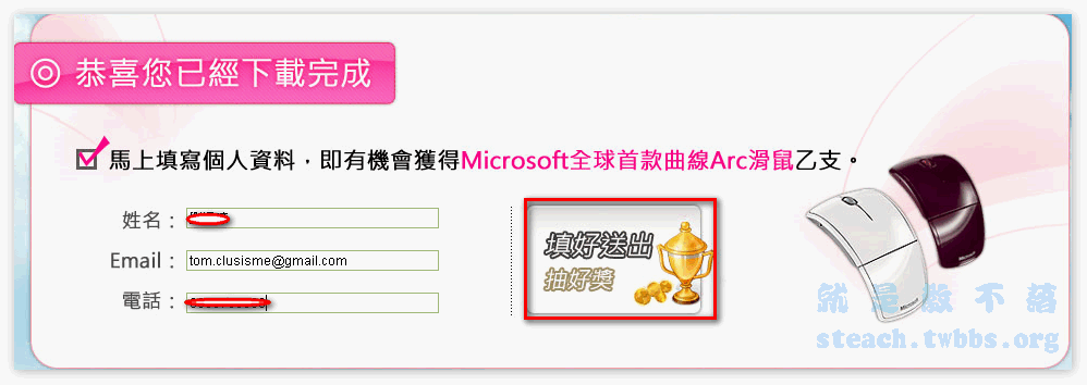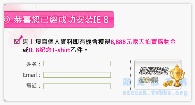 當你下載安裝完成後,再用IE8瀏覽器開啟IE8官網,就可以點擊參加抽獎,填入資料參加第2重的抽獎囉!