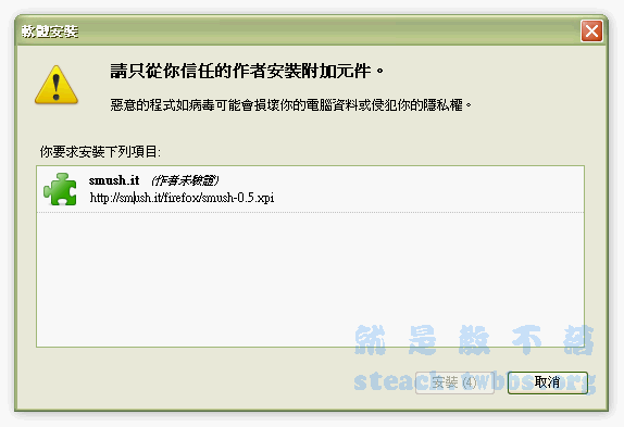 〝INSTALL SMUSH.IT for firefox〞,咦?針對Firefox的小工具耶,沒錯,如果你有在用FF瀏覽器的人,就可以來試試這一個小工具囉,有了這小工具就可以一次將別人家的圖片一次下載回來,而且還幫你瘦好身哦!