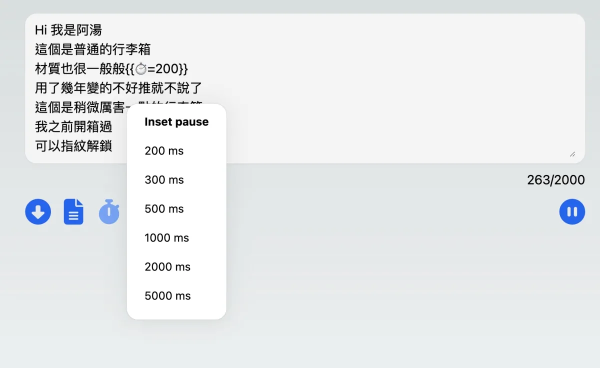 在需要隔開一點的段落還可以插入間隔時間,這真的很方便,也是文字轉語音工具中比較少見的功能,完成後就可以試聽,沒問題就下載來使用吧。