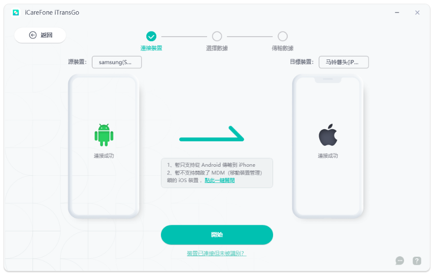 使用USB線將你的安卓手機和iPhone 16分別連接到電腦。確保兩台設備都能被正確識別並點擊「開始」。