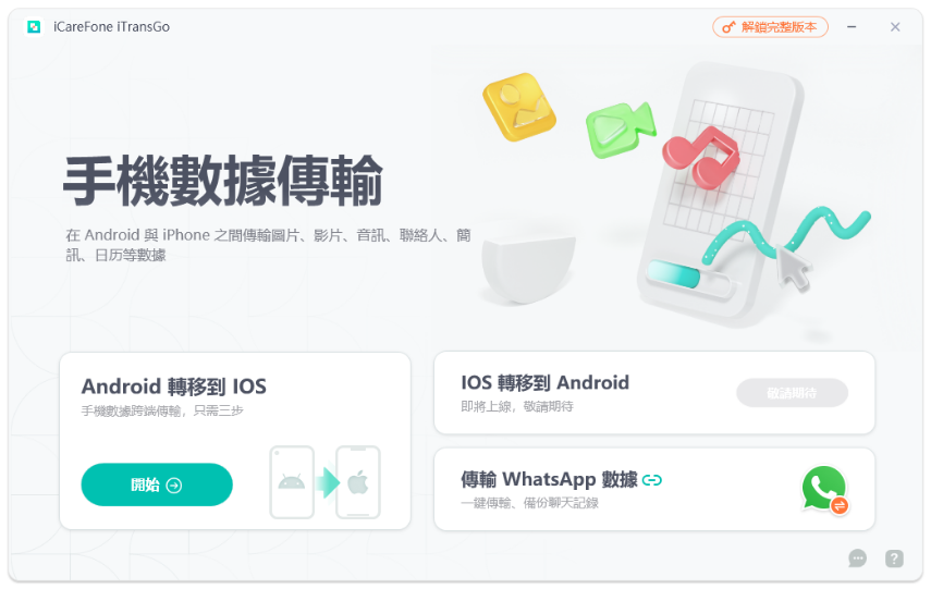 - 全方位資料轉移: 支持轉移聯絡人、照片、影片、音樂、應用數據等類型。